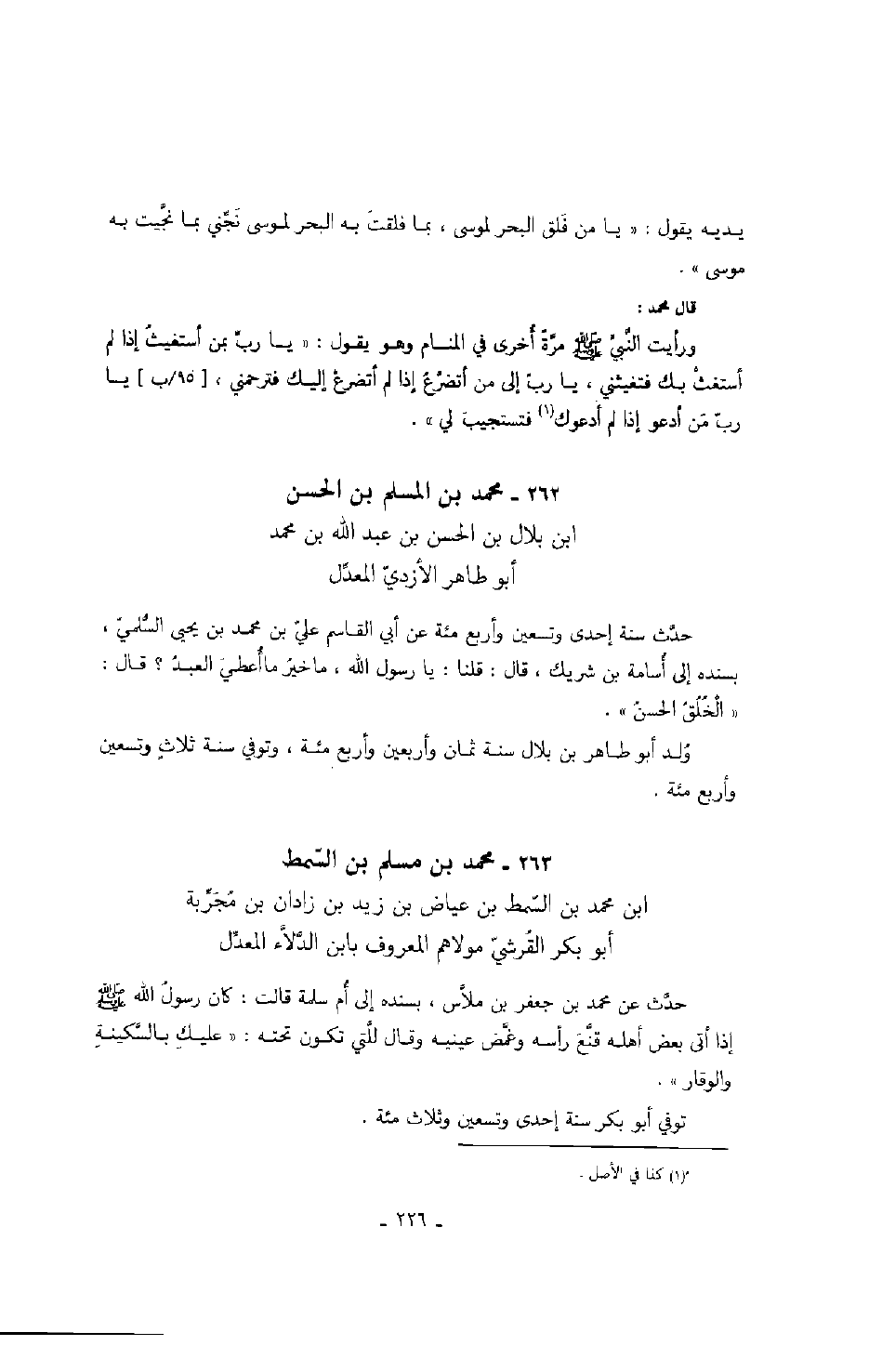 ابن محمد بن السمط بن عياض بن زيد بن زادان بن مجربة أبو بكر القرشي مولاهم المعروف بابن الدلاء المعدل حدث عن محمد بن جعفر بن ملاس، بسنده إلى أم سلمة قالت: كان رسول الله صَلَّى اللهُ عَلَيْهِ وَسَلَّمَ إذا أتى بعض أهله قنع رأسه وغمض عينيه وقال للتي تكون تحته: " عليك بالسكينة والوقار ".