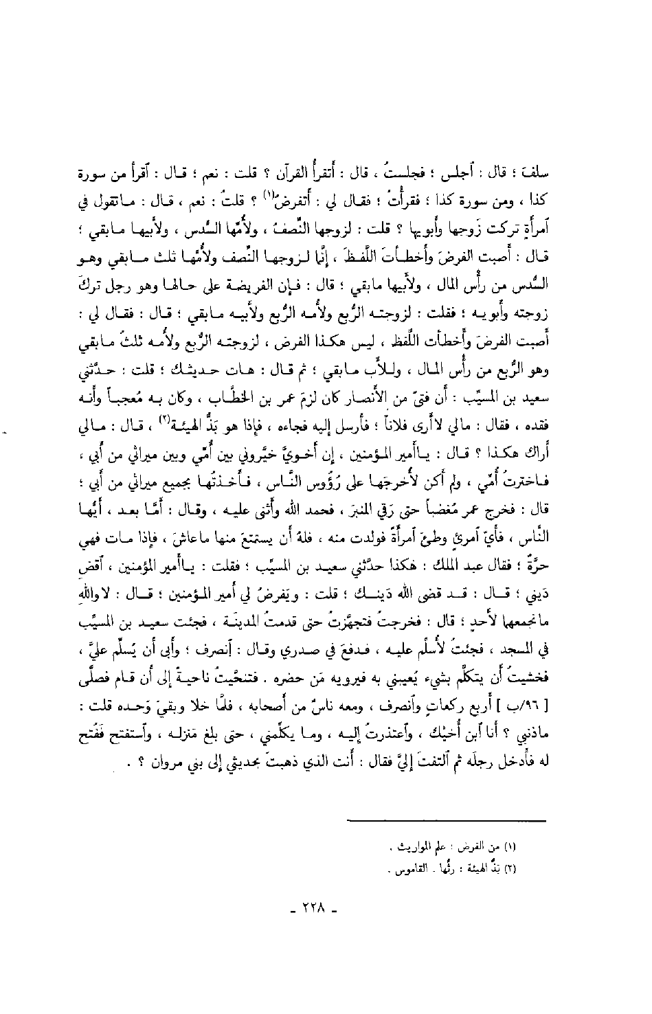 سلف؛ قال: اجلس؛ قال: أتقرأ القرآن؟ قلت: نعم؛ قال: اقرأ من سورة كذا، ومن سورة كذا؛ فقرأت فقال لي: أتفرض؟ قلت: نعم، قال: ما تقول في امرأةٍ تركت زوجها وأبويها؟ قلت: لزوجها النصف، ولأمها السدس، ولأبيها ما بقي؛ قال: أصبت الفرض وأخطأت اللفظ، إنما لزوجها النصف ولأمها ثلث ما بقي وهو السدس من رأس المال، ولأبيها ما بقي؛ قال: فإن الفريضة على حالها وهو رجل ترك زوجته وأبويه؛ فقلت: لزوجته الربع ولأمه الربع ولأبيه ما بقي؛ قال: فقال لي: أصبت الفرض وأخطأت اللفظ، ليس هكذا الفرض، لزوجته الربع ولأمه ثلث ما بقي وهو الربع من رأس المال، وللأب ما بقي؛ ثم قال: هات حديثك؛ قلت: حدثني سعيد بن المسيب: أن فتىً من الأنصار كان لزم عمر بن الخطاب، وكان به معجباً وأنه فقده، فقال: ما لي لا أرى فلاناً؛ فأرسل إليه فجاءه، فإذا هو بذ الهيئة، قال: ما لي أراك هكذا؟ قال: يا أمير المؤمنين، إن أخوي خيروني بين أمي وبين ميراثي من أبي، فاخترت أمي، ولم أكن لأخرجها على رؤوس الناس، فأخذتها بجميع ميراثي من أبي؛ قال: فخرج عمر مغضباً حتى رقي المنبر، فحمد الله وأثنى عليه، وقال: أما بعد، أيها الناس، فأي امرئٍ وطئ امرأةً فولدت منه، فله أن يستمتع منها ما عاش، فإذا مات فهي حرةٌ؛ فقال عبد الملك: هكذا حدثني سعيد بن المسيب؛ فقلت: يا أمير المؤمنين، اقض ديني؛ قال: قد قضى الله دينك؛ قلت: ويفرض لي أمير المؤمنين؛ قال: لا والله ما نجمعهما لأحدٍ؛ قال: فخرجت فتجهزت حتى قدمت المدينة، فجئت سعيد بن المسيب في المسجد، فجئت لأسلم عليه، فدفع في صدري وقال: انصرف؛ وأبى أن يسلم علي، فخشيت أن يتكلم بشيء يعيبني به فيرويه من حضره. فتنحيت ناحيةً إلى أن قام فصلى أربع ركعاتٍ وانصرف، ومعه ناسٌ من أصحابه، فلما خلا وبقي وحده قلت: ما ذنبي؟ أنا ابن أخيك، واعتذرت إليه، وما يكلمني، حتى بلغ منزله، واستفتح ففتح له فأدخل رجله ثم التفت إلي فقال: أنت الذي ذهبت بحديثي إلى بني مروان؟.
