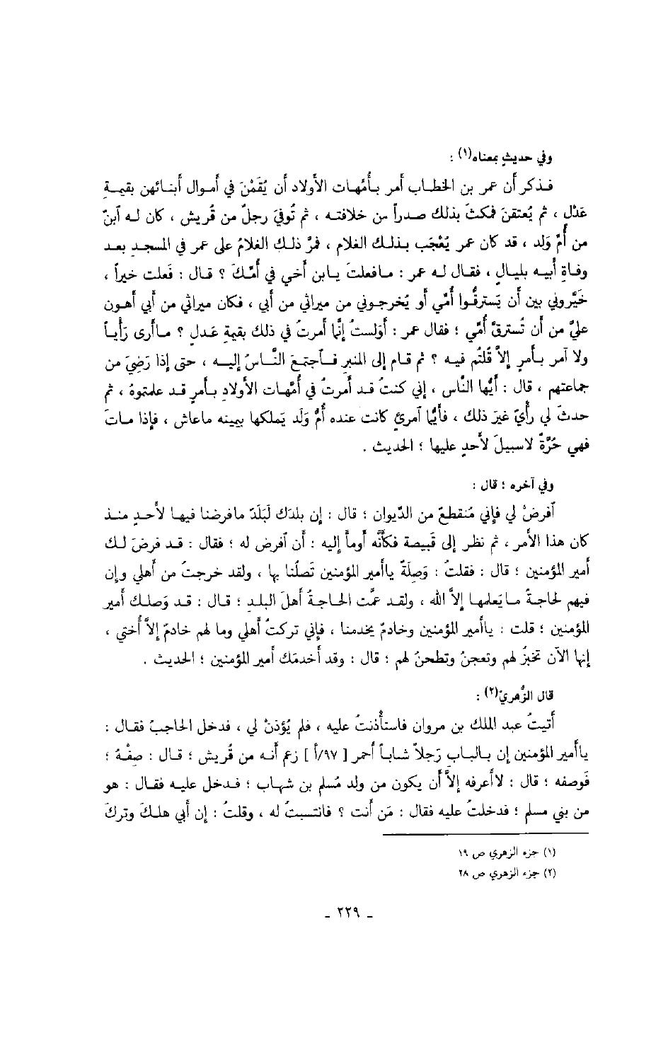 فذكر أن عمر بن الخطاب أمر بأمهات الأولاد أن يقمن في أموال أبنائهن بقيمة عدل، ثم يعتقن فمكث بذلك صدراً من خلافته، ثم توفي رجلٌ من قريش، كان له ابنٌ من أم ولد، قد كان عمر يعجب بذلك الغلام، فمر ذلك الغلام على عمر في المسجد بعد وفاة أبيه بليالٍ، فقال له عمر: ما فعلت يا بن أخي في أمك؟ قال: فعلت خيراً، خيروني بين أن يسترقوا أمي أو يخرجوني من ميراثي من أبي، فكان ميراثي من أبي أهون علي من أن تسترق أمي؛ فقال عمر: أولست إنما أمرت في ذلك بقيمة عدلٍ؟ ما أرى رأياً ولا آمر بأمرٍ إلا قلتم فيه؟ ثم قام إلى المنبر فاجتمع الناس إليه، حتى إذا رضي من جماعتهم، قال: أيها الناس، إني كنت قد أمرت في أمهات الأولاد بأمرٍ قد علمتموه، ثم حدث لي رأيٌ غير ذلك، فأيما امرئٍ كانت عنده أم ولد يملكها بيمينه ما عاش، فإذا مات فهي حرةٌ لا سبيل لأحدٍ عليها؛ الحديث.