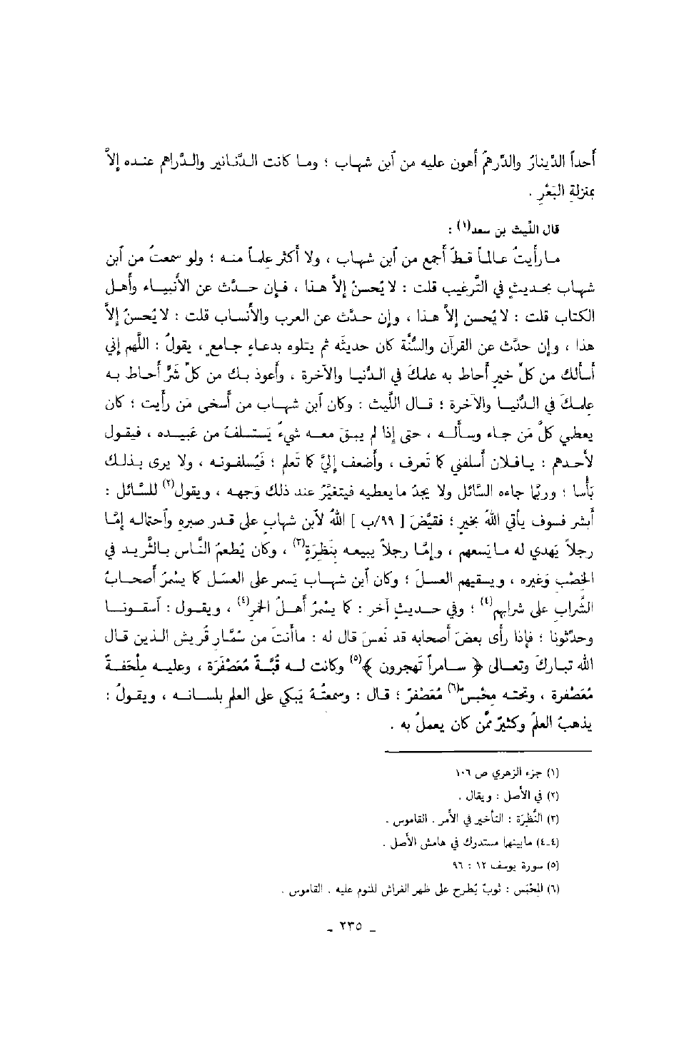 قال الليث بن سعد: ما رأيت عالماً قط أجمع من ابن شهاب، ولا أكثر علماً منه؛ ولو سمعت من ابن شهاب بحيثٍ في الترغيب قلت: لا يحسن إلا هذا، فإن حدث عن الأنبياء وأهل الكتاب قلت: لا يحسن إلا هذا، وإن حدث عن العرب والأنساب قلت: لا يحسن إلا هذا، وإن حدث عن القرآن والسنة كان حديثه ثم يتلوه بدعاءٍ جامعٍ، يقول: اللهم إني أسألك من كل خيرٍ أحاط به علمك في الدنيا والآخرة، وأعوذ بك من كل شر أحاط به علمك في الدنيا والآخرة؛ قال الليث: وكان ابن شهاب من أسخى من رأيت؛ كان يعطي كل من جاء وسأله، حتى إذا لم يبق معه شيءٌ يستسلف من عبيده، فيقول لأحدهم: يا فلان أسلفني كما تعرف، وأضعف إلي كما تعلم؛ فيسلفونه، ولا يرى بذلك بأساً؛ وربما جاءه السائل ولا يجد ما يعطيه فيتغير عند ذلك وجهه، ويقول للسائل: أبشر فسوف يأتي الله بخيرٍ؛ فقيض الله لابن شهابٍ على قدر صبره واحتماله إما رجلاً يهدي له ما يسعهم، وإما رجلاً يبيعه بنظرةٍ، وكان يطعم الناس بالثريد في الخصب وغيره، ويسقيهم العسل؛ وكان ابن شهاب يسمر على العسل كما يسمر أصحاب الشراب على شرابهم؛ وفي حديثٍ آخر: كما يسمر أهل الخمر، ويقول: اسقونا وحدثونا؛ فإذا رأى بعض أصحابه قد نعس قال له: ما أنت من سمار قريش الذين قال الله تبارك وتعالى " سامراً تهجرون " وكانت له قبةٌ معصفرة، وعليه ملحفةٌ معصفرة، وتحته محبسٌ معصفرٌ؛ قال: وسمعته يبكي على العلم بلسانه، فيقول: يذهب العلم وكثيرٌ ممن كان يعمل به.