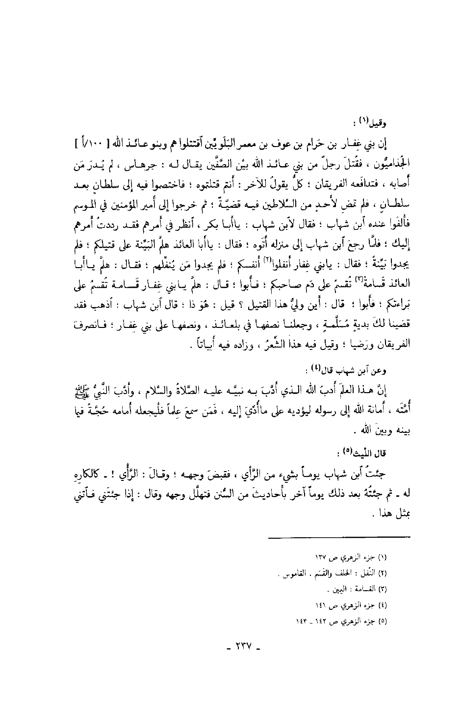 وقيل: إن بني غفار بن حرام بن عوف بن معمر البلويين اقتتلوا هم وبنو عائذ الله الجذاميون، فقتل رجلٌ من بني عائذ الله بين الصفين يقال له: جرهاس، لم يدر من أصابه، فتدافعه الفريقان؛ كل يقول للآخر: أنتم قتلتموه؛ فاختصموا فيه إلى سلطانٍ بعد سلطانٍ، فلم تمض لأحدٍ من السلاطين فيه قضيةٌ؛ ثم خرجوا إلى أمير المؤمنين في الموسم فألفوا عنده ابن شهاب؛ فقال لابن شهاب: يا أبا بكر، انظر في أمرهم فقد رددت أمرهم إليك؛ فلما رجع ابن شهاب إلى منزله أتوه؛ فقال: يا أبا العائذ هلم البينة على قتيلكم؛ فلم يجدوا بينةً؛ فقال: يا بني غفار أنفلوا أنفسكم؛ فلم يجدوا من ينفلهم؛ فقال: هلم يا أبا العائذ قسامةً تقسم على دم صاحبكم؛ فأبوا؛ قال: هلم يا بني غفار قسامة تقسم على براءتكم؛ فأبوا؛ قال: أين ولي هذا القتيل؟ قيل: هو ذا؛ قال ابن شهاب: اذهب فقد قضينا لك بديةٍ مسلمةٍ، وجعلنا نصفها في بلعائذ، ونصفها على بني غفار؛ فانصرف الفريقان ورضيا؛ وقيل فيه هذا الشعر، وزاده فيه أبياتاً.
