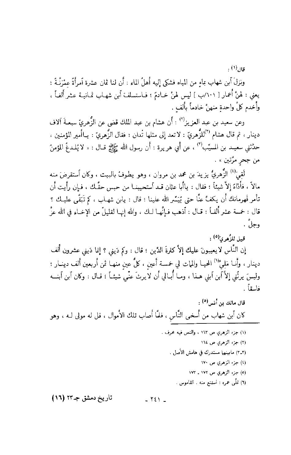 وعن سعيد بن عبد العزيز: أن هشام بن عبد الملك قضى عن الزهري سبعة آلاف دينار، ثم قال هشام للزهري: لا تعد إلى مثلها تدان؛ فقال الزهري: يا أمير المؤمنين، حدثني سعيد بن المسيب، عن أبي هريرة: أن رسول الله صَلَّى اللهُ عَلَيْهِ وَسَلَّمَ قال: " لا يلدغ المؤمن في حجرٍ مرتين ".