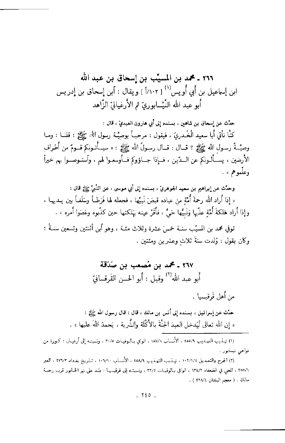 ابن عبد الله ابن إسماعيل بن أبي أويس ويقال: ابن إسحاق بن إدريس أبو عبد الله النيسابوري ثم الأرغياني الزاهد حدث عن إسحاق بن شاهين، بسنده إلى أبي هارون العبدي، قال: كنا نأتي أبا سعيد الخدري، فيقول: مرحباً بوصية رسول الله صَلَّى اللهُ عَلَيْهِ وَسَلَّمَ؛ قلنا: وما وصية رسول الله صَلَّى اللهُ عَلَيْهِ وَسَلَّمَ؟ قال: قال رسول الله صَلَّى اللهُ عَلَيْهِ وَسَلَّمَ: " سيأتونكم قومٌ من أطراف الأرضين، يسألونكم عن الدين، فإذا جاؤوكم فأوسعوا لهم، واستوصوا بهم خيراً وعلموهم ".