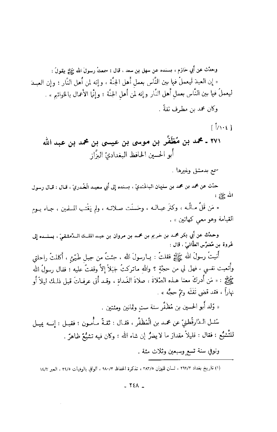حدث عن محمد بن محمد بن سليمان الباغندي، بسنده إلى أبي سعيد الخدري، قال: قال رسول الله صَلَّى اللهُ عَلَيْهِ وَسَلَّمَ: " من قل ماله، وكثر عياله، وحسنت صلاته، ولم يغتب المسلمين، جاء يوم القيامة وهو معي كهاتين ".