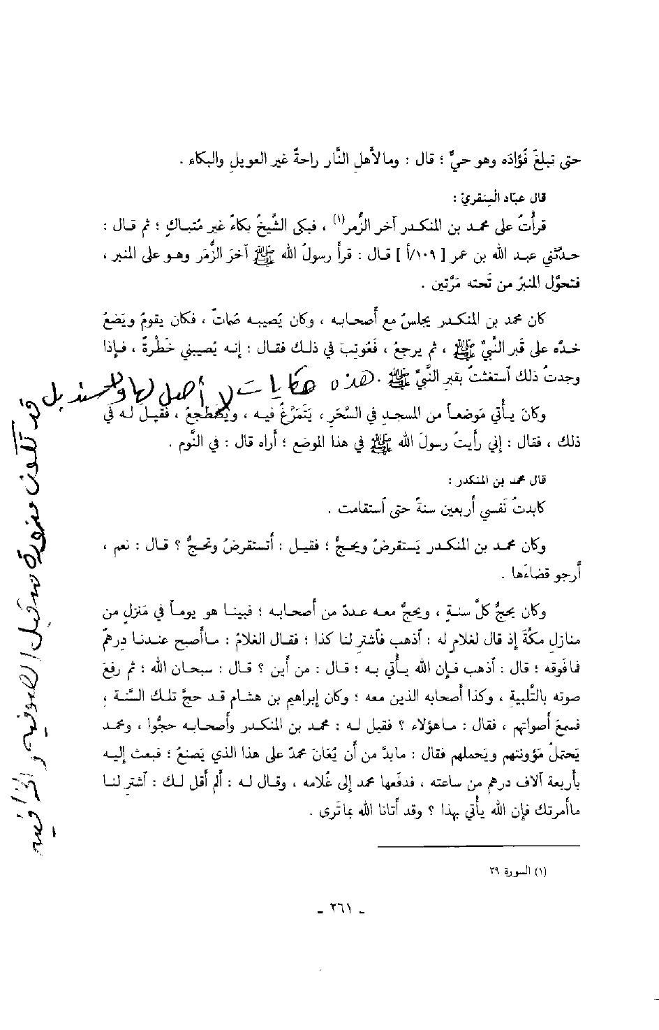 قال عباد المنقري: قرأت على محمد بن المنكدر آخر الزمر، فبكى الشيخ بكاءً غير متباكٍ؛ ثم قال: حدثني عبد الله بن عمر قال: قرأ رسول الله صَلَّى اللهُ عَلَيْهِ وَسَلَّمَ آخر الزمر وهو على المنبر، فتحول المنبر من تحته مرتين.
