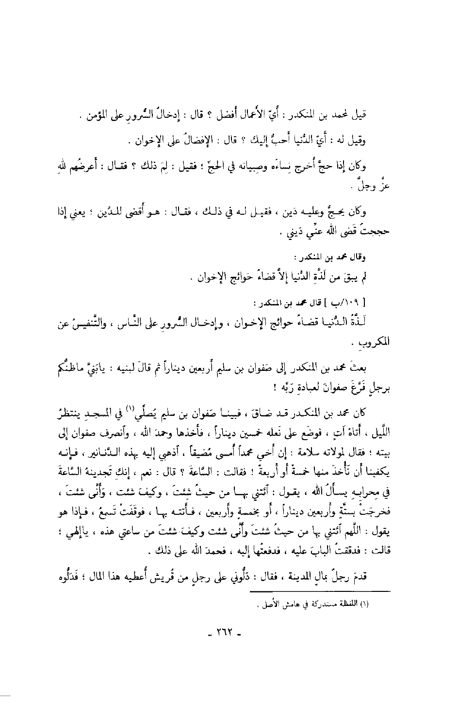 بعث محمد بن المنكدر إلى صفوان بن سليم أربعين ديناراً ثم قال لبنيه: يا بني ما ظنكم برجلٍ فرغ صفوان لعبادة ربه كان محمد بن المنكدر قد ضاق، فبينا صفوان بن سليم يصلي في المسجد ينتظر الليل، أتاه آتٍ، فوضع على نعله خمسين ديناراً، فأخذها وحمد الله، وانصرف صفوان إلى بيته؛ فقال لمولاته سلامة: إن أخي محمداً أمسى مضيقاً، اذهبي إليه بهذه الدنانير، فإنه يكفينا أن نأخذ منها خمسةً أو أربعةً فقالت: الساعة؟ قال: نعم، إنك تجدينه الساعة في محرابه يسأل الله، يقول: ائتني بها من حيث شئت، وكيف شئت، وأنى شئت، فخرجت بستةٍ وأربعين ديناراً، أو بخمسةٍ وأربعين، فأتته بها، فوقفت تسمع، فإذا هو يقول: اللهم ائتني بها من حيث شئت وأنى شئت وكيف شئت من ساعتي هذه، يا إلهي؛ قالت: فدققت الباب عليه، فدفعتها إليه، فحمد الله على ذلك.