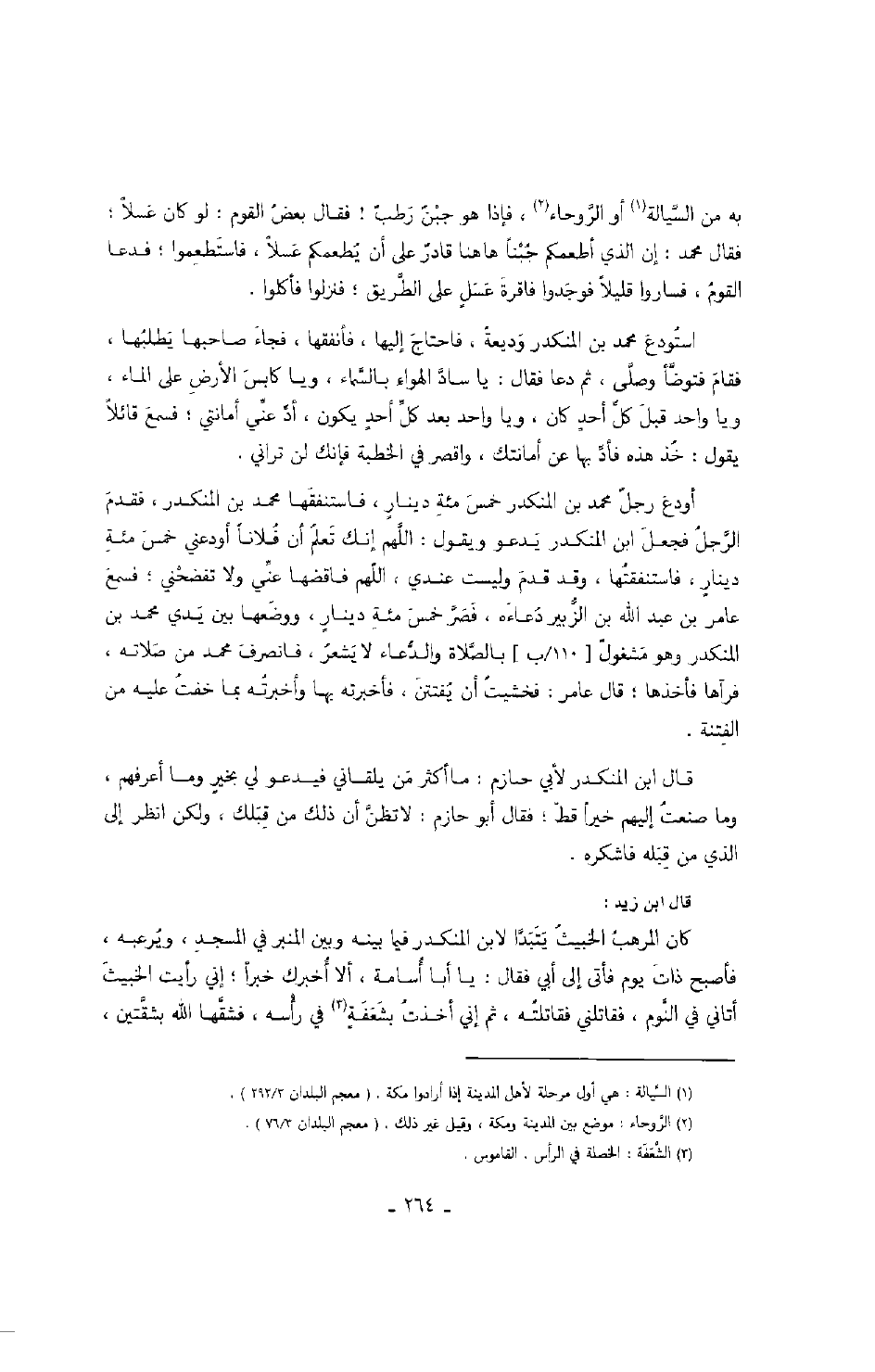 استودع محمد بن المنكدر وديعةً، فاحتاج إليها، فأنفقها، فجاء صاحبها يطلبها، فقام فتوضأ وصلى، ثم دعا فقال: يا ساد الهواء بالسماء، ويا كابس الأرض على الماء، ويا واحد قبل كل أحدٍ كان، ويا واحد بعد كل أحدٍ يكون، أد عني أمانتي؛ فسمع قائلاً يقول: خذ هذه فأد بها عن أمانتك، واقصر في الخطبة فإنك لن تراني.