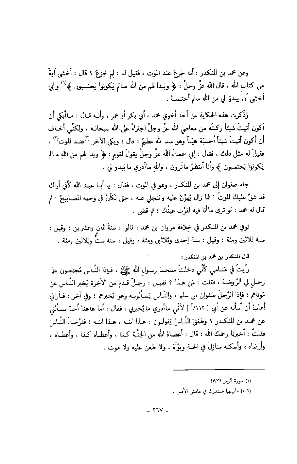 وعن محمد بن المنكدر: أنه جزع عند الموت، فقيل له: لم تجزع؟ قال: أخشى آيةً من كتاب الله، قال الله عز وجل: " وبدا لهم من الله ما لم يكونوا يحتسبون " وإني أخشى أن يبدو لي من الله ما لم أحتسب.