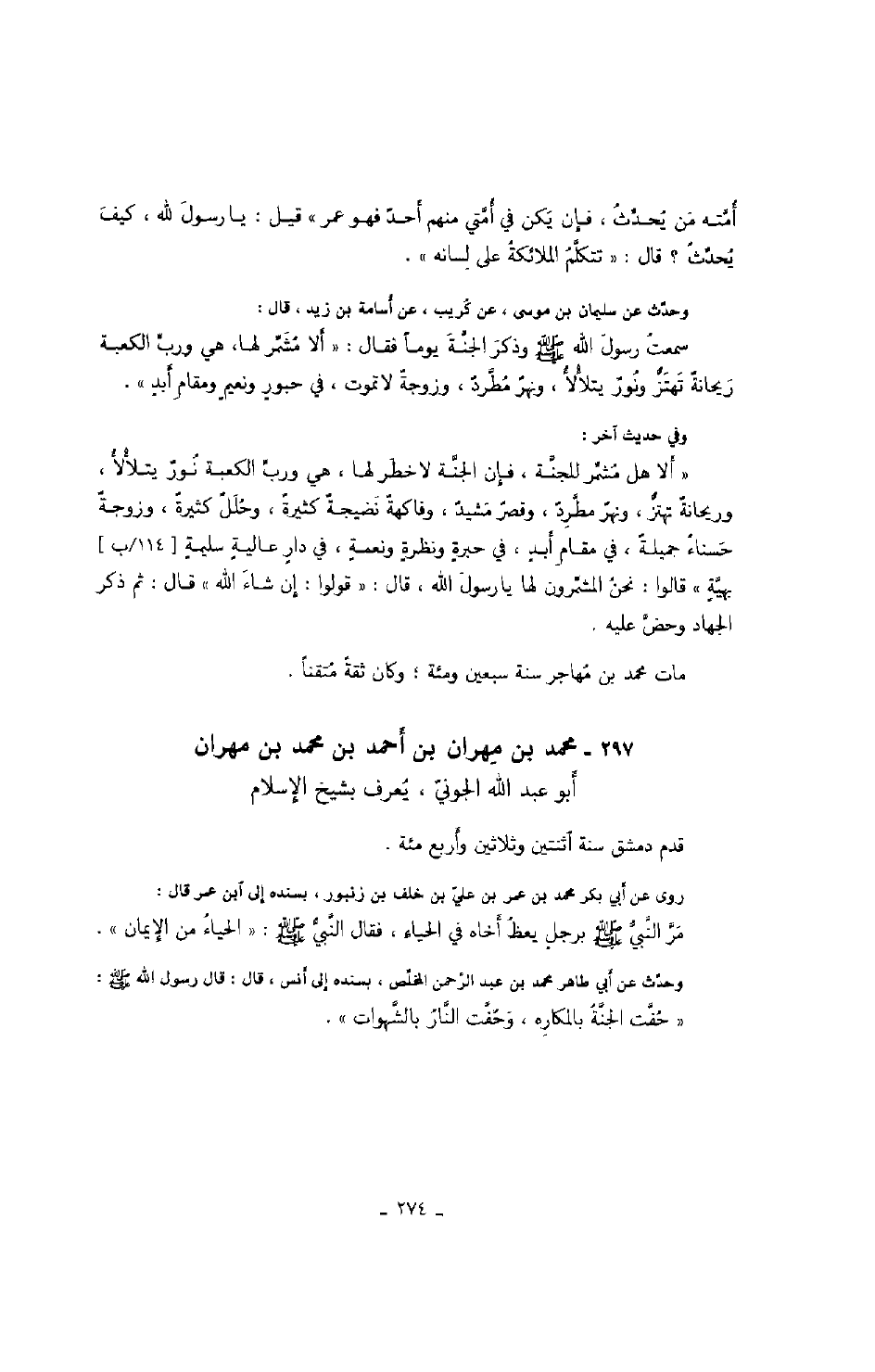 وحدث عن سليمان بن موسى، عن كريب، عن أسامة بن زيد، قال: سمعت رسول صَلَّى اللهُ عَلَيْهِ وَسَلَّمَ وذكر الجنة يوماً فقال: " ألا مشمر لها، هي ورب الكعبة ريحانةٌ تهتز ونورٌ يتلألأ، ونهرٌ مطردٌ، وزوجة لا تموت، في حبورٍ ونعيمٍ ومقام أبدٍ ".