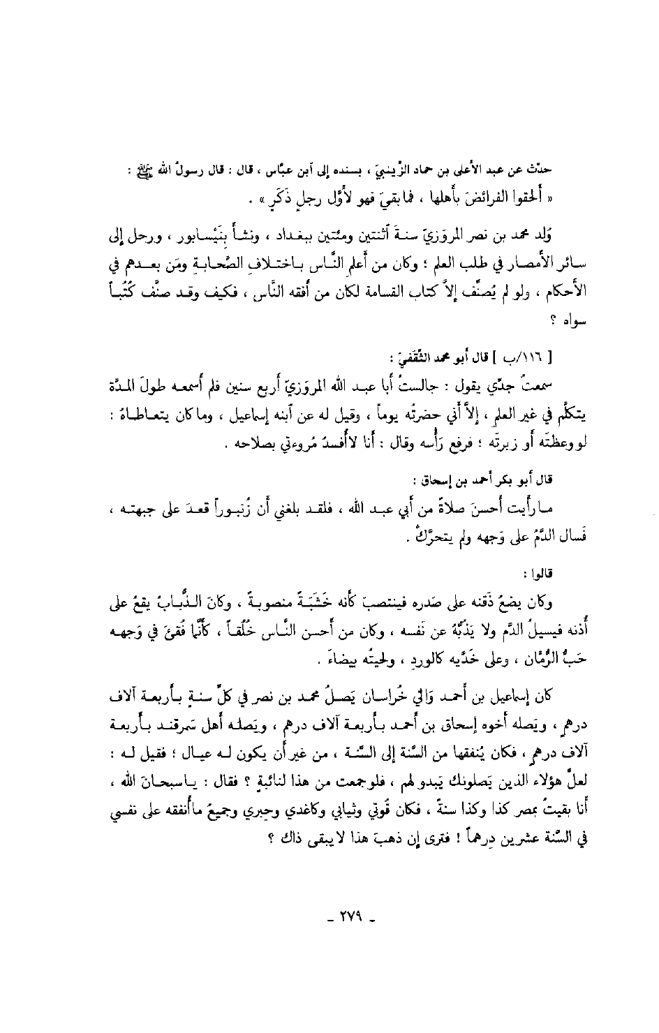ولد محمد بن نصر المروزي سنة اثنتين ومئتين ببغداد، ونشأ بنيسابور، ورحل إلى سائر الأمصار في طلب العلم؛ وكان من أعلم الناس باختلاف الصحابة ومن بعدهم في الأحكام، ولو لم يصنف إلا كتاب القسامة لكان من أفقه الناس، فكيف وقد صنف كتباً سواه؟ قال أبو محمد الثقفي: سمعت جدي يقول: جالست أبا عبد الله المروزي أربع سنين فلم أسمعه طول المدة يتكلم في غير العلم، إلا أني حضرته يوماً، وقيل له عن ابنه إسماعيل، وما كان يتعاطاه: لو وعظته أو زبرته؛ فرفع رأسه وقال: أنا لا أفسد مروءتي بصلاحه.