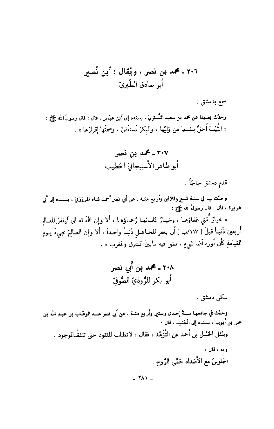 وحدث بصيدا عن محمد بن سعيد التستري، بسنده إلى ابن عباس، قال: قال رسول الله صَلَّى اللهُ عَلَيْهِ وَسَلَّمَ: " الثيب أحق بنفسها من وليها، والبكر تستأذن، وصمتها إقرارها ".
