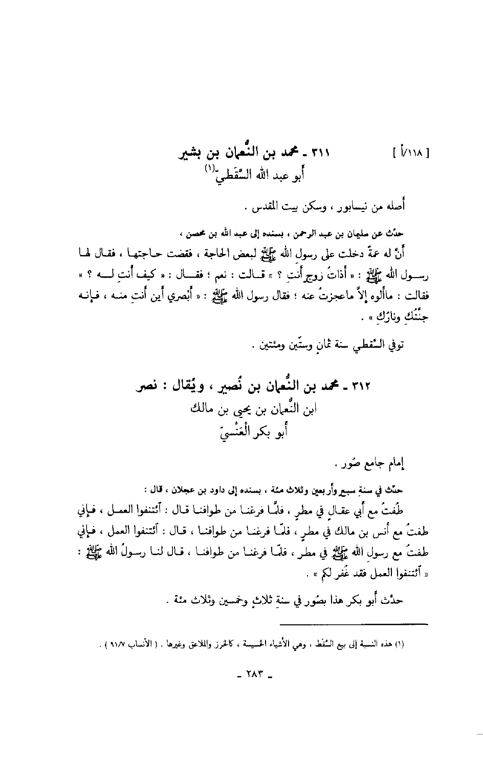 حدث عن سليمان بن عبد الرحمن، بسنده إلى عبد الله بن محصن، أن له عمةً دخلت على رسول الله صَلَّى اللهُ عَلَيْهِ وَسَلَّمَ لبعض الحاجة، فقضت حاجتها، فقال لها رسول الله صَلَّى اللهُ عَلَيْهِ وَسَلَّمَ: " أذات زوجٍ أنت؟ " قالت: نعم؛ فقال: " كيف أنت له؟ " فقالت: ما ألوه إلا ما عجزت عنه؛ فقال رسول الله صَلَّى اللهُ عَلَيْهِ وَسَلَّمَ: " أبصري أين أنت منه، فإنه جنتك ونارك ".