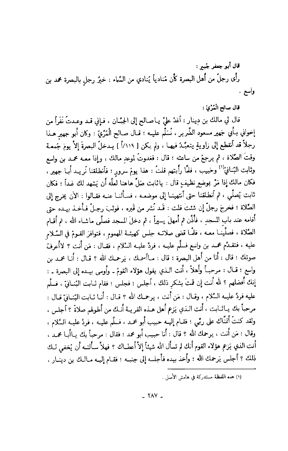 قال لي مالك بن دينار: اغد علي يا صالح إلى الجبان، فإني قد وعدت نفراً من إخواني بأبي جهير مسعود الضرير، نسلم عليه؛ قال صالح المري: وكان أبو جهيرٍ هذا رجلاً قد انقطع إلى زاويةٍ يتعبد فيها، ولم يكن يدخل البصرة إلا يوم جمعة وقت الصلاة، ثم يرجع من ساعته؛ قال: فغدوت لموعد مالك، وإذا معه محمد بن واسع وثابت البناني وحبيب، فلما رأيتهم قلت: هذا يوم سرورٍ؛ فانطلقنا نريد أبا جهير، فكان مالك إذا مر بموضعٍ نظيفٍ قال: يا ثابت صل ها هنا لعله أن يشهد لك غداً؛ فكان ثابت يصلي، ثم انطلقنا حتى انتهينا إلى موضعه، فسألنا عنه فقالوا: الآن يخرج إلى الصلاة؛ فخرج رجلٌ إن شئت قلت: قد نشر من قبره، فوثب رجلٌ فأخذ بيده حتى أقامه عند باب المسجد، فأذن ثم أمهل يسيراً، ثم دخل المسجد فصلى ما شاء الله، ثم أقام الصلاة، فصلينا معه، فلما قضى صلاته جلس كهيئة المهموم، فتوافر القوم في السلام عليه، فتقدم محمد بن واسع فسلم عليه، فرد عليه والسلام، فقال: من أنت؟ لا أعرف صوتك؛ قال: أنا من أهل البصرة؛ قال: ما اسمك، يرحمك الله؟ قال: أنا محمد بن واسع؛ قال: مرحباً وأهلاً، أنت الذي يقول هؤلاء القوم وأومى بيده إلى البصرة: إنك أفضلهم؟ لله أنت إن قمت بشكر ذلك، اجلس؛ فجلس؛ فقام ثابت البناني، فسلم عليه فرد عليه السلام، وقال: من أنت، يرحمك الله؟ قال: أنا ثابت البناني قال: مرحباً بك يا ثابت، أنت الذي يزعم أهل هذه القرية أنك من أطولهم صلاةً؟ اجلس، ولقد كنت أتمناك على ربي؛ فقام إليه حبيب أبو محمد، فسلم عليه، فرد عليه السلام، وقال: من أنت، يرحمك الله؟ قال: أنا حبيب أبو محمد؛ فقال: مرحباً بك يا أبا محمد، أنت الذي يزعم هؤلاء القوم أنك لم تسأل الله شيئاً إلا أعطاك؟ فهلا سألته أن يخفي لك ذلك؟ اجلس يرحمك الله؛ وأخذ بيده فأجلسه إلى جنبه؛ فقام إليه مالك بن دينار،