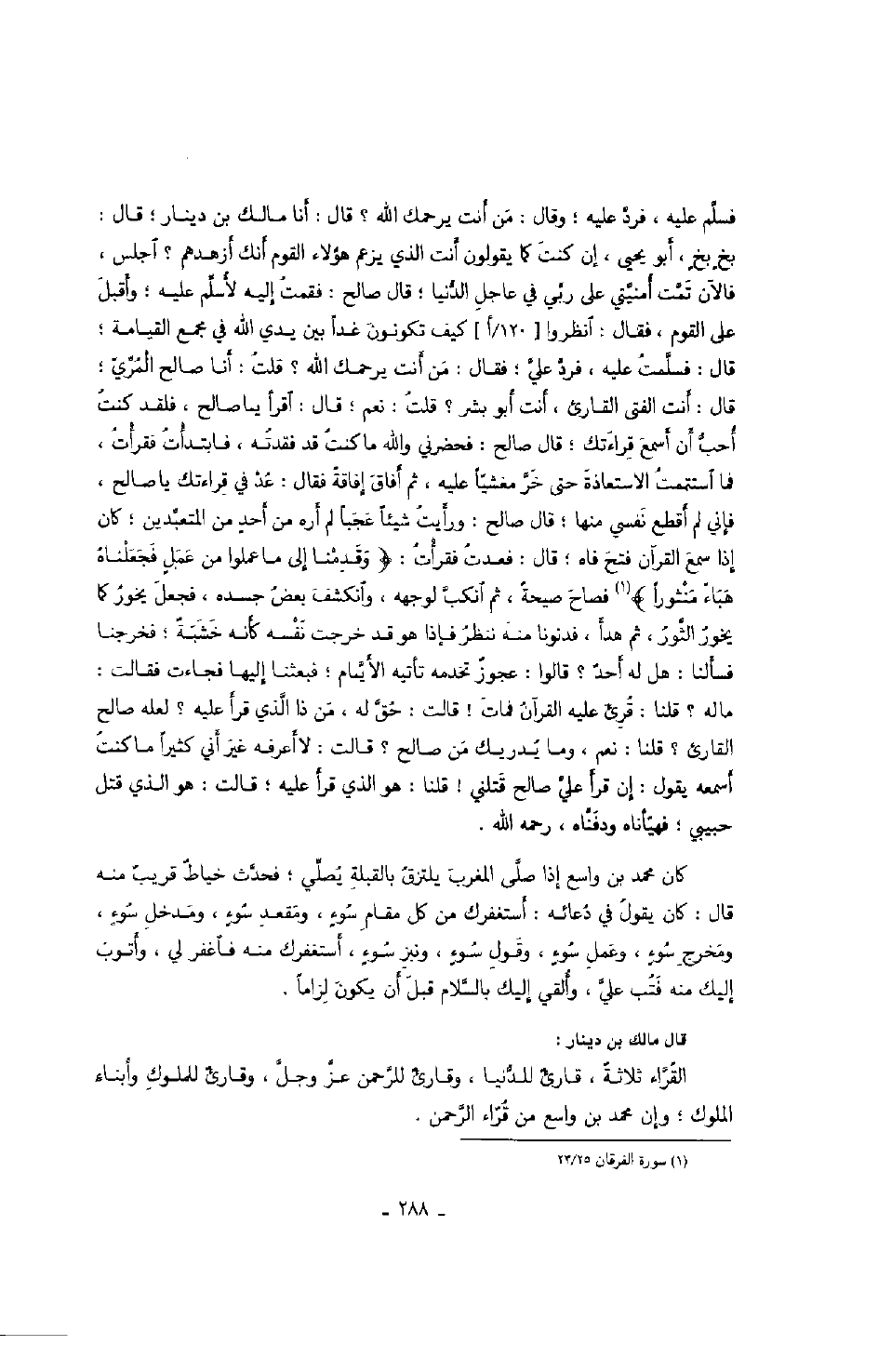 فسلم عليه، فرد عليه؛ وقال: من أنت يرحمك الله؟ قال: أنا مالك بن دينار؛ قال: بخٍ بخٍ، أبو يحيى، إن كنت كما يقولون أنت الذي يزعم هؤلاء القوم أنك أزهدهم؟ اجلس، فالآن تمت أمنيتي على ربي في عاجل الدنيا؛ قال صالح: فقمت إليه لأسلم عليه؛ وأقبل على القوم، فقال: انظروا كيف تكونون غداً بين يدي الله في مجمع القيامة؛ قال: فسلمت عليه، فرد علي؛ فقال: من أنت يرحمك الله؟ قلت: أنا صالح المري؛ قال: أنت الفتى القارئ، أنت أبو بشر؟ قلت: نعم؛ قال: اقرأ يا صالح، فلقد كنت أحب أن أسمع قراءتك؛ قال صالح: فحضرني والله ما كنت قد فقدته، فابتدأت فقرأت، فما استتممت الاستعاذة حتى خر مغشياً عليه، ثم أفاق إفاقةً فقال: عد في قراءتك يا صالح، فإني لم أقطع نفسي منها؛ قال صالح: ورأيت شيئاً عجباً لم أره من أحدٍ من المتعبدين؛ كان إذا سمع القرآن فتح فاه؛ قال: فعدت فقرأت: " " وقدمنا إلى ما عملوا من عملٍ فجعلناه هباءً منثوراً " فصاح صيحةً، ثم انكب لوجهه، وانكشف بعض جسده، فجعل يخور كما يخور الثور، ثم هدأ، فدنونا منه ننظر فإذا هو قد خرجت نفسه كأنه خشبةٌ؛ فخرجنا فسألنا: هل له أحدٌ؟ قالوا: عجوزٌ تخدمه تأتيه الأيام؛ فبعثنا إليها فجاءت فقالت: ما له؟ قلنا: قرئ عليه القرآن فمات قالت: حق له، من ذا الذي قرأ عليه؟ لعله صالح القارئ؟ قلنا: نعم، وما يدريك من صالح؟ قالت: لا أعرفه غير أني كثيراً ما كنت أسمعه يقول: إن قرأ علي صالح قتلني قلنا: هو الذي قرأ عليه؛ قالت: هو الذي قتل حبيبي؛ فهيأناه ودفناه، رحمه الله.