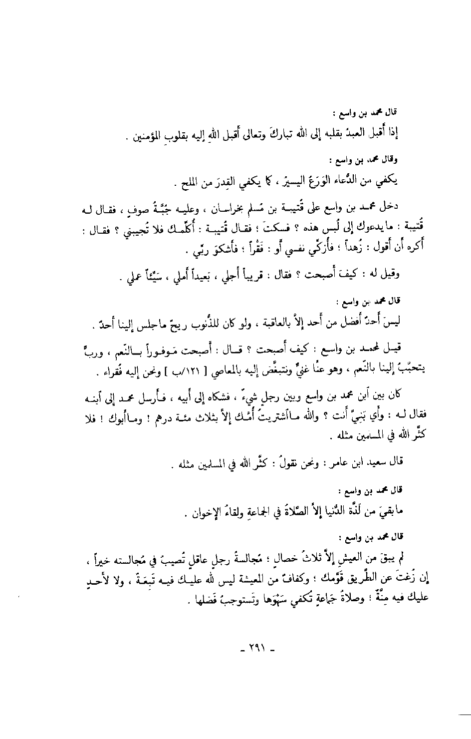 قال محمد بن واسع: لم يبق من العيش إلا ثلاث خصالٍ؛ مجالسة رجلٍ عاقلٍ تصيب في مجالسته خيراً، إن زغت عن الطريق قومك؛ وكفافٌ من المعيشة ليس لله عليك فيه تبعةٌ، ولا لأحدٍ عليك فيه منةٌ؛ وصلاة جماعةٍ تكفي سهوها وتستوجب فضلها.