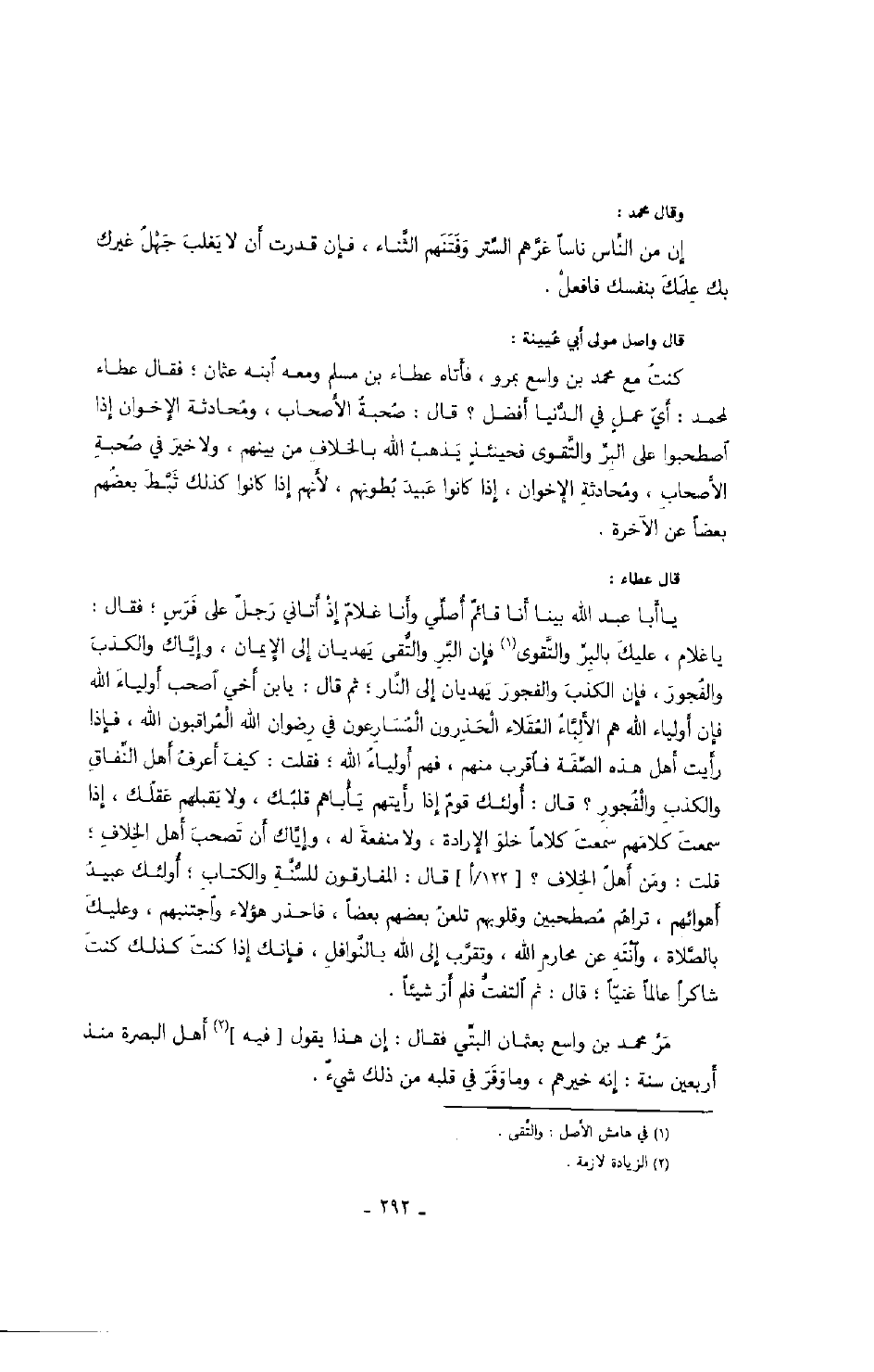 كنت مع محمد بن واسع بمرو، فأتاه عطاء بن مسلم ومعه ابنه عثمان؛ فقال عطاء لمحمد: أي عملٍ في الدنيا أفضل؟ قال: صحبة الأصحاب، ومحادثة الإخوان إذا اصطحبوا على البر والتقوى فحينئذٍ يذهب الله بالخلاف من بينهم، ولا خير في صحبة الأصحاب، ومحادثة الإخوان، إذا كانوا عبيد بطونهم، لأنهم إذا كانوا كذلك ثبط بعضهم بعضاً عن الآخرة.