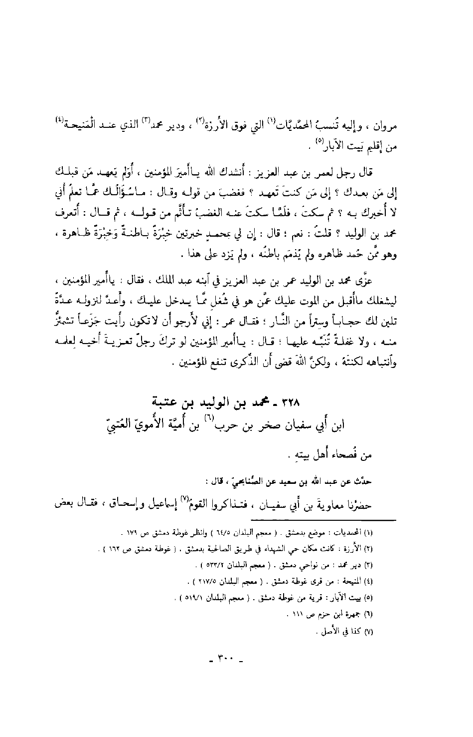 عزى محمد بن الوليد عمر بن عبد العزيز في ابنه عبد الملك، فقال: يا أمير المؤمنين، ليشغلك ما أقبل من الموت عليك عمن هو في شغل مما يدخل عليك، وأعد لنزوله عدةً تلين لك حجاباً وستراً من النار؛ فقال عمر: إني لأرجو أن لا تكون رأيت جزعاً تشمئز منه، ولا غفلةً تنبه عليها؛ قال: يا أمير المؤمنين لو ترك رجلٌ تعزية أخيه لعلمه وانتباهه لكنته، ولكن الله قضى أن الذكرى تنفع المؤمنين.