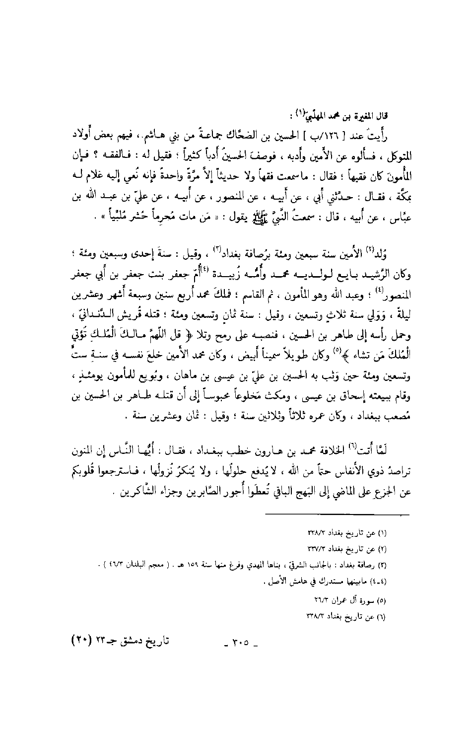 ولد الأمين سنة سبعين ومئة برصافة بغداد، وقيل: سنة إحدى وسبعين ومئة؛ وكان الرشيد بايع لولديه محمد وأمه زبيدة أم جعفر بنت جعفر بن أبي جعفر المنصور؛ وعبد الله وهو المأمون، ثم القاسم؛ فملك محمد أربع سنين وسبعة أشهر وعشرين ليلةً، وولي سنة ثلاثٍ وتسعين، وقيل: سنة ثمانٍ وتسعين ومئة؛ قتله قريش الدنداني، وحمل رأسه إلى طاهر بن الحسين، فنصبه على رمح وتلا " قل اللهم مالك الملك تؤتي الملك من تشاء " وكان طويلاً سميناً أبيض، وكان محمد الأمين خلع نفسه في سنة ست وتسعين ومئة حين وثب به الحسين بن علي بن عيسى بن ماهان، وبويع للمأمون يومئذٍ، وقام ببيعته إسحاق بن عيسى، ومكث مخلوعاً محبوساً إلى أن قتله طاهر بن الحسين بن مصعب ببغداد، وكان عمره ثلاثاً وثلاثين سنة؛ وقيل: ثمان وعشرين سنة.