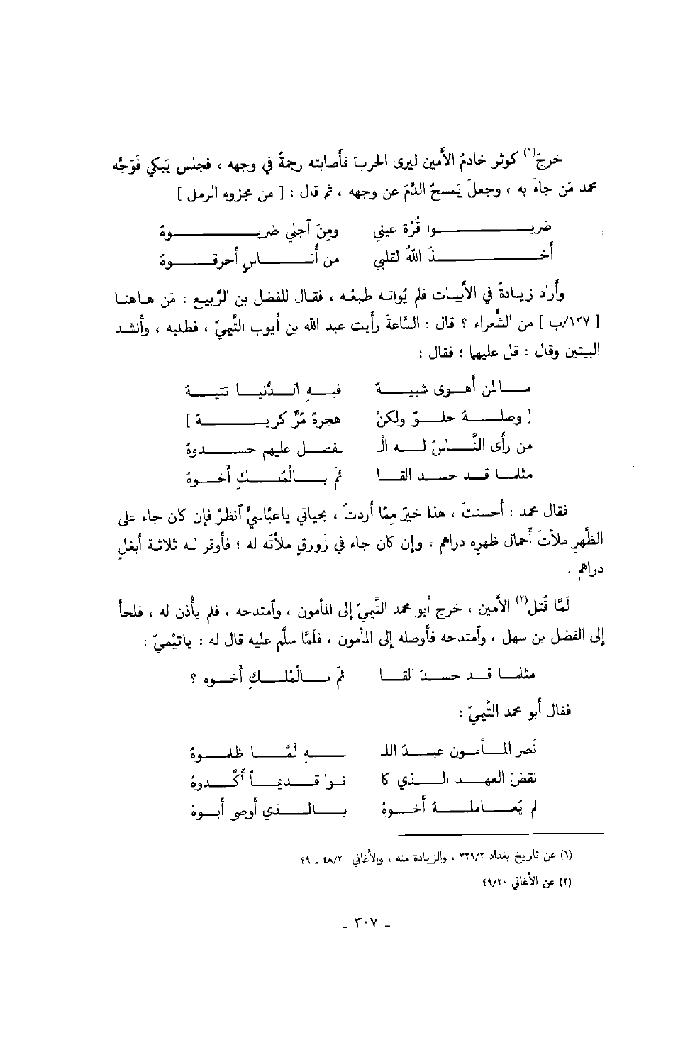 وأراد زيادةً في الأبيات فلم يواته طبعه، فقال للفضل بن الربيع: من ها هنا من الشعراء؟ قال: الساعة رأيت عبد الله بن أيوب التيمي، فطلبه، وأنشد البيتين وقال: قل عليهما؛ فقال: