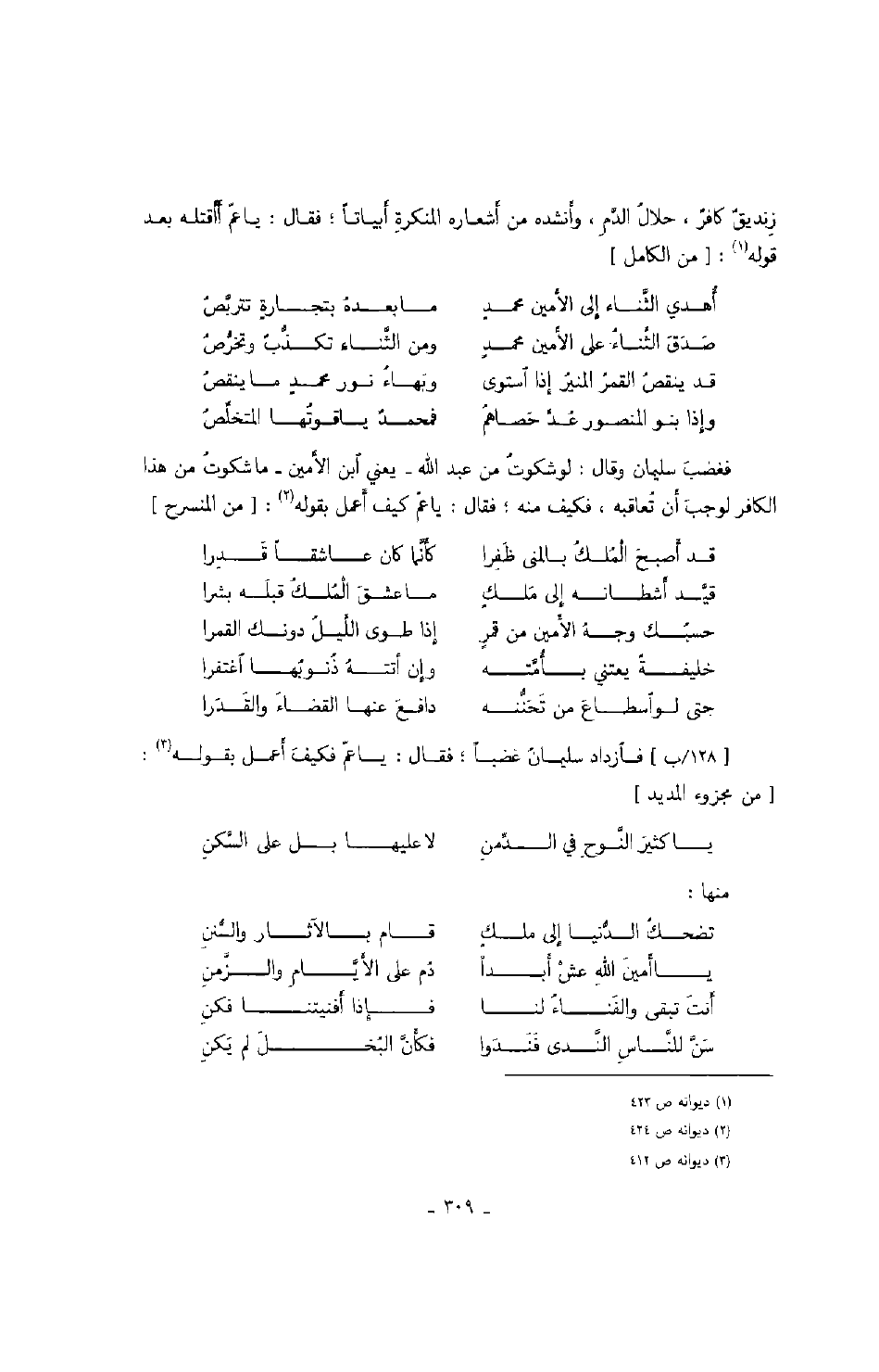 فغضب سليمان وقال: لو شكوت من عبد الله يعني ابن الأمين ما شكوت من هذا الكافر لوجب أن تعاقبه، فكيف منه؛ فقال: يا عم كيف أعمل بقوله: من المنسرح
