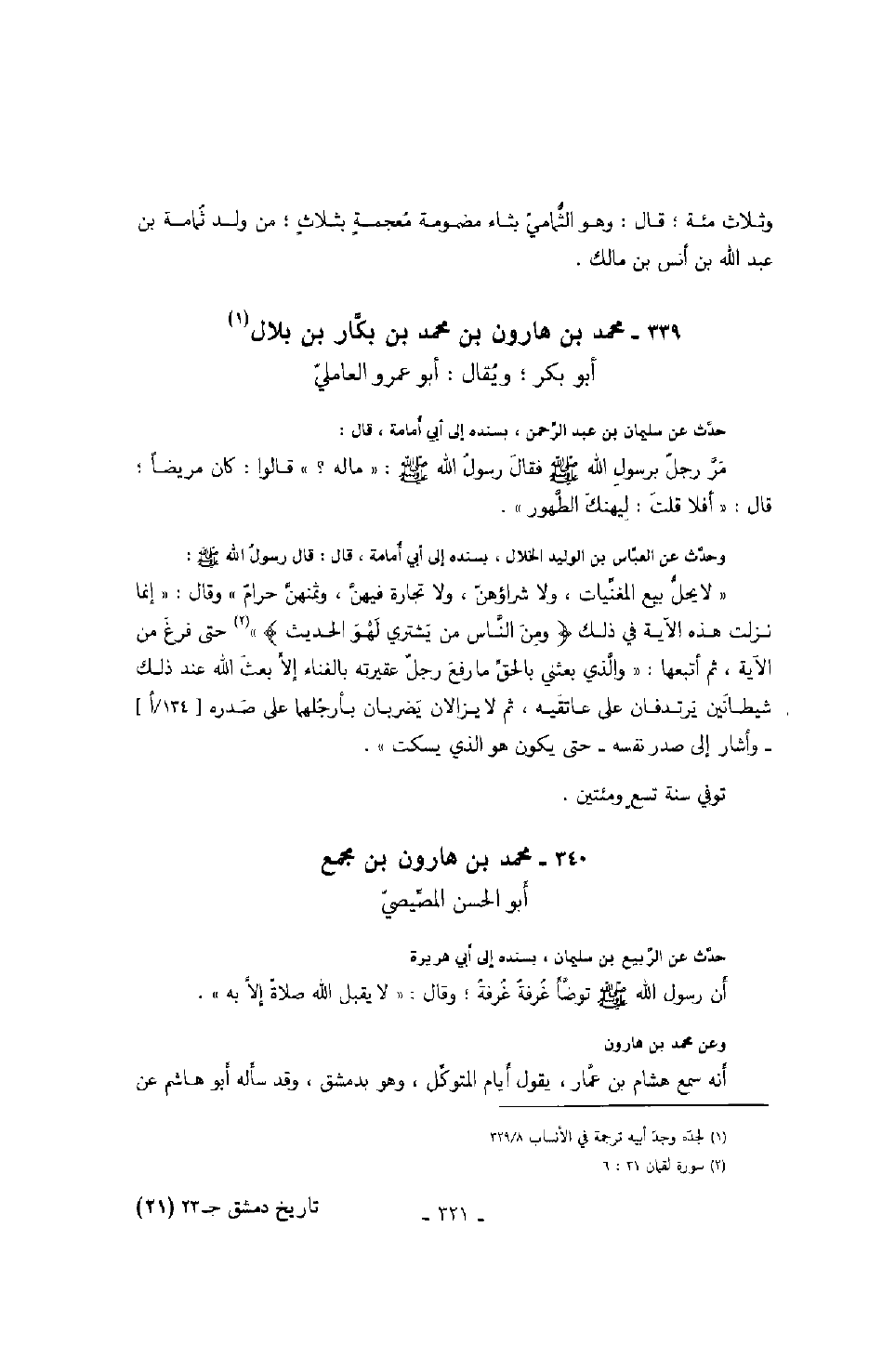 ابن بلال أبو بكر؛ ويقال: أبو عمرو العاملي حدث عن سليمان بن عبد الرحمن، بسنده إلى أبي أمامة، قال: مر رجلٌ برسول الله صَلَّى اللهُ عَلَيْهِ وَسَلَّمَ فقال رسول الله صَلَّى اللهُ عَلَيْهِ وَسَلَّمَ: " ما له؟ " قالوا: كان مريضاً؛ قال: " أفلا قلت: ليهنك الطهور ".