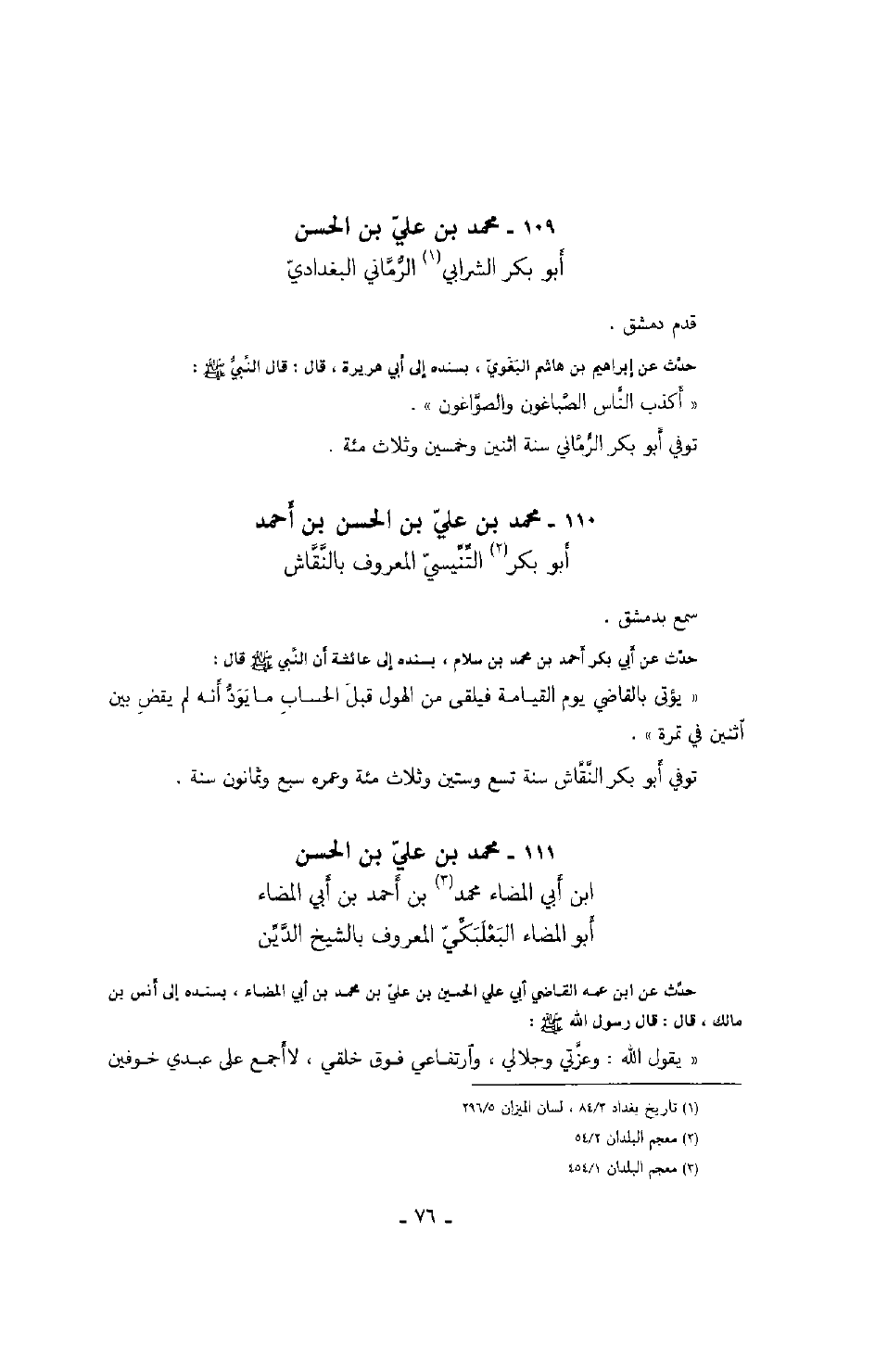 ابن أبي المضاء أبو المضاء البعلبكي المعروف بالشيخ الدين حدث عن ابن عمه القاضي أبي علي الحسين بن علي بن محمد بن أبي المضاء، بسنده إلى أنس بن مالك، قال: قال رسول الله صَلَّى اللهُ عَلَيْهِ وَسَلَّمَ: " يقول الله: وعزتي وجلالي، وارتفاعي فوق خلقي، لا أجمع على عبدي خوفين
