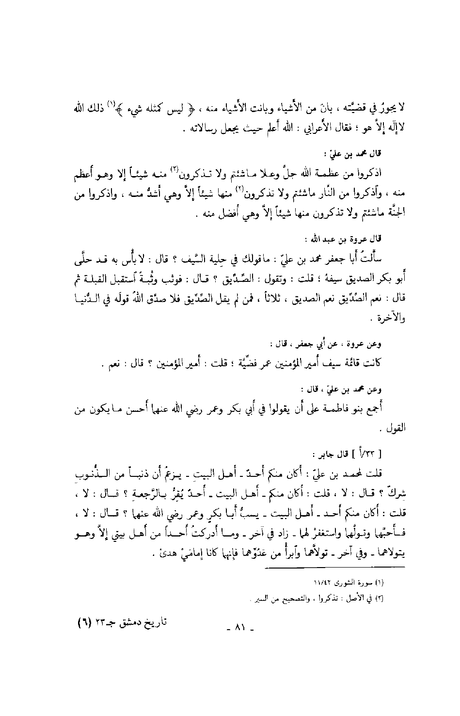 قال عروة بن عبد الله: سألت أبا جعفر محمد بن علي: ما قولك في حلية السيف؟ قال: لا بأس به قد حلى أبو بكر الصديق سيفه؛ قلت: وتقول: الصديق؟ قال: فوثب وثبةً استقبل القبلة ثم قال: نعم الصديق نعم الصديق، ثلاثاً، فمن لم يقل الصديق فلا صدق الله قوله في الدنيا والآخرة.