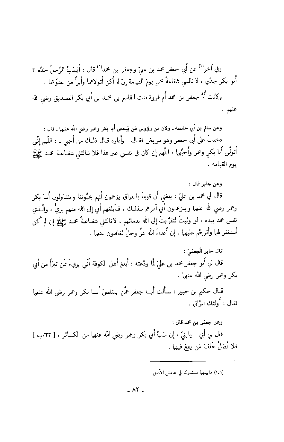 وفي آخر عن أبي جعفر محمد بن علي وجعفر بن محمد قال: أيسب الرجل جده؟ أبو بكر جدي، لا نالتني شفاعة محمدٍ يوم القيامة إن لم أكن أتولاهما وأبرأ من عدوهما.