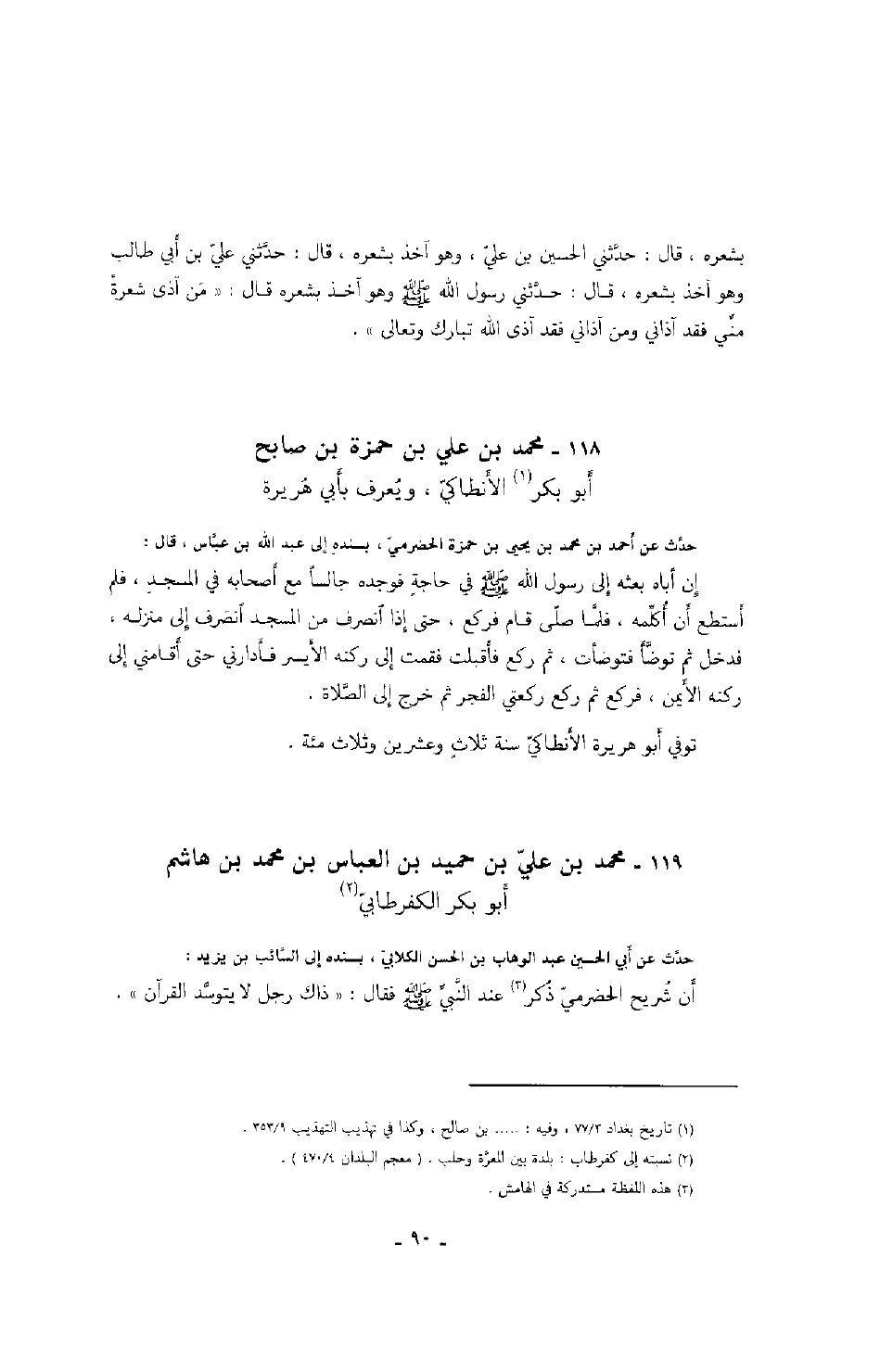ابن محمد بن هاشم أبو بكر الكفرطابي حدث عن أبي الحسين عبد الوهاب بن الحسن الكلابي، بسنده إلى السائب بن يزيد: أن شريح الحضرمي ذكر عند النبي صَلَّى اللهُ عَلَيْهِ وَسَلَّمَ فقال: " ذاك رجل لا يتوسد القرآن ".