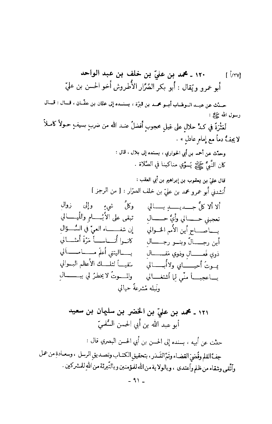 ابن عبد الواحد أبو عمرو ويقال: أبو بكر الصرار الأطروش أخو الحسن بن علي حدث عن عبد الوهاب أبو محمد بن قبرة، بسنده إلى عثمان بن عفان، قال: قال رسول الله صَلَّى اللهُ عَلَيْهِ وَسَلَّمَ: لعثرةٌ في كد حلالٍ على عيلٍ محجوبٍ أفضل عند الله من ضربٍ بسيفٍ حولاً كاملاً لا يجف دماً مع إمامٍ عادلٍ ".