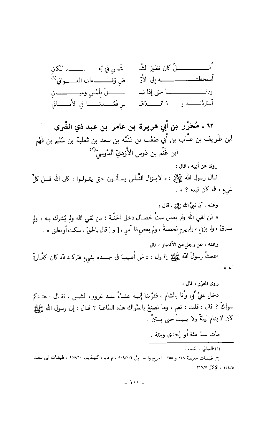 ابن عبد ذي الشرى بن طريف بن عتاب بن أبي صعب بن منبه بن سعد ابن ثعلبة بن سليم بن فهمبن غنم بن دوس الأزدي الدوسي روى عن أبيه، قال: قال رسول الله صَلَّى اللهُ عَلَيْهِ وَسَلَّمَ: " لا يزال الناس يسألون حتى يقولون: كان الله قبل كل شيء، فما كان قبله؟ ".