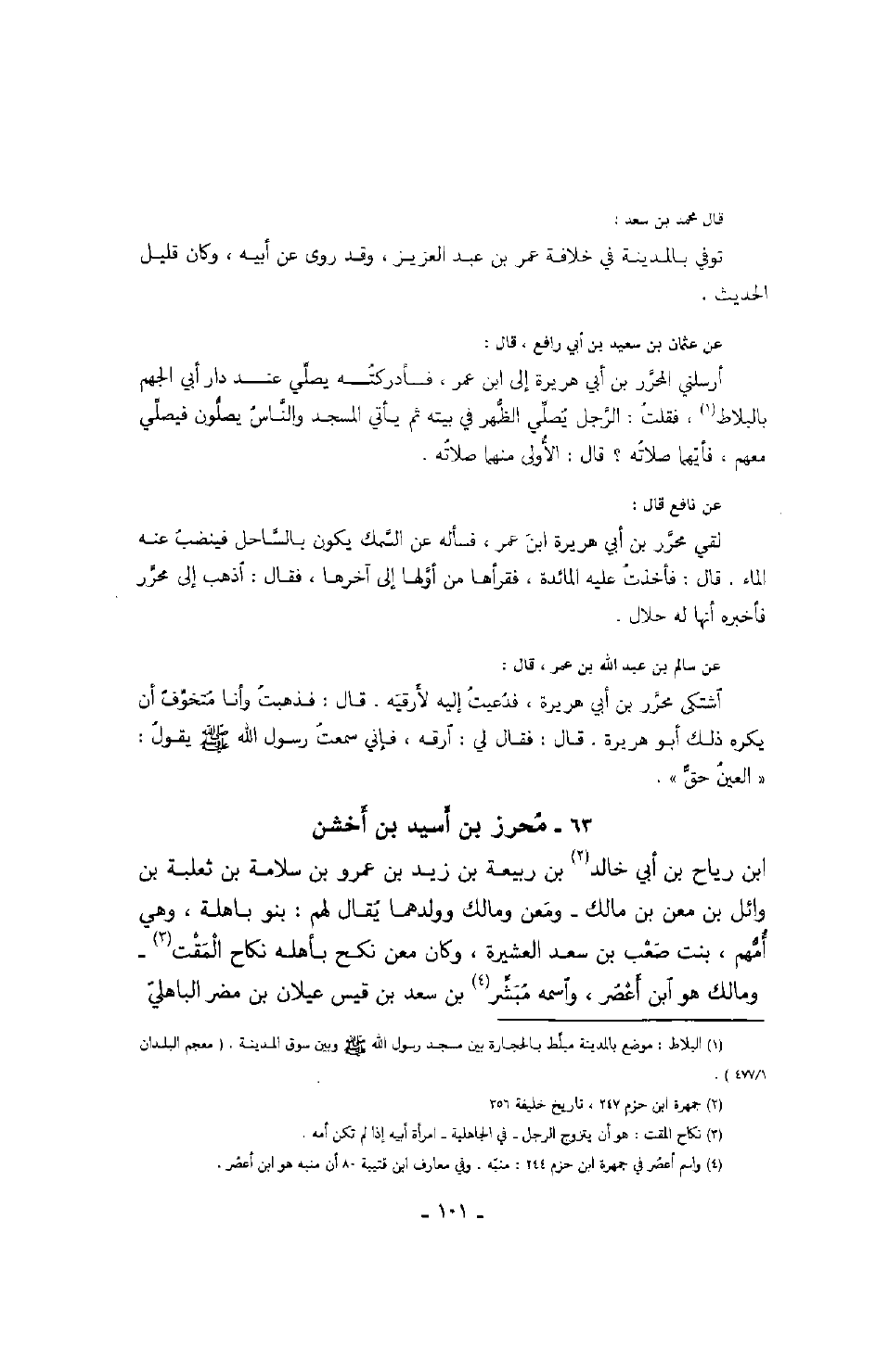 عن نافع قال: لقي محرر بن أبي هريرة ابن عمر، فسأله عن السمك يكون بالساحل فينضب عنه الماء. قال: فأخذت عليه المائدة، فقرأها من أولها إلى آخرها، فقال: اذهب إلى محرر فأخبره أنها له حلال.