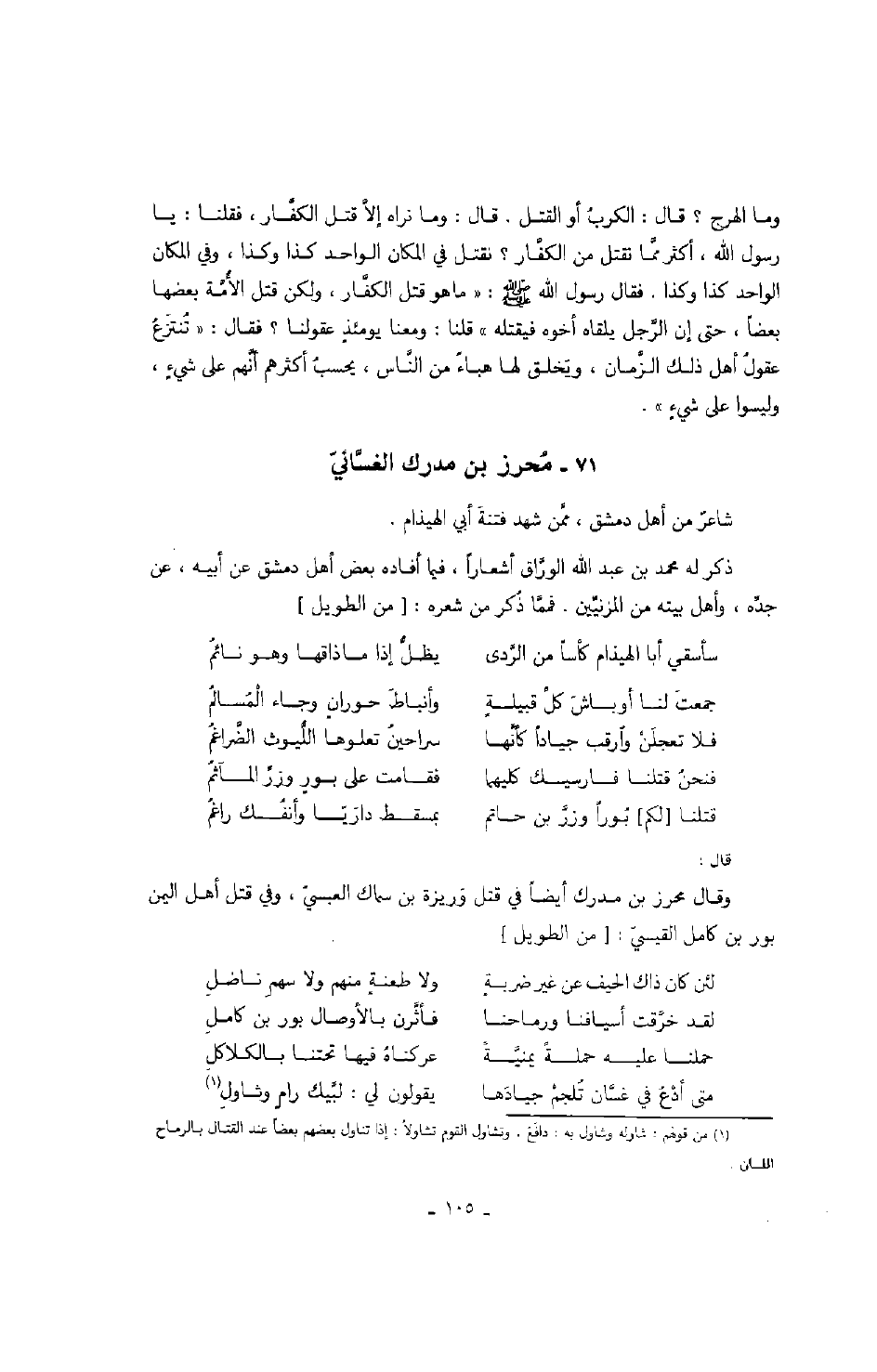 قال: وقال محرز بن مدرك أيضاً في قتل وريزة بن سماك العبسي، وفي قتل أهل اليمن بور بن كامل القيسي: " من الطويل "