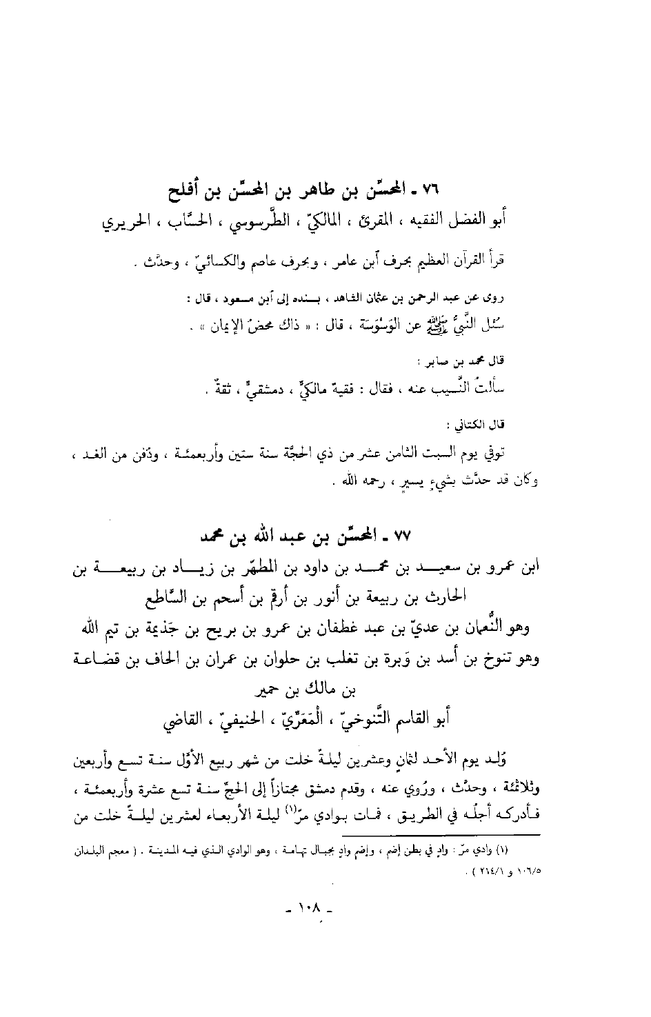 ابن عمرو بن سعيد بن محمد بن داود بن المطهر بن زياد بن ربيعة بن الحارث بن ربيعة بن أنور بن أرقم بن أسحم بن الساطع وهو النعمان بن عدي بن عبد غطفان بن عمرو بن بريح بن جذيمة بن تيم الله وهو تنوخ بن أسد بن وبرة بن تغلب بن حلوان بن عمران بن الحاف بن قضاعة بن مالك بن حمير أبو القاسم التنوخي، المعري، الحنيفي، القاضي ولد يوم الأحد لثمان وعشرين ليلة خلت من شهر ربيع الأول سنة تسع وأربعين وثلاثمئة، حدوث، وروى عنه، وقدم دمشق مجتازاً إلى الحج سنة تسع عشرة وأربعمئة، فأدركه أجله في الطريق، فمات بوادي مر ليلة الأربعاء لعشرين ليلة خلت من