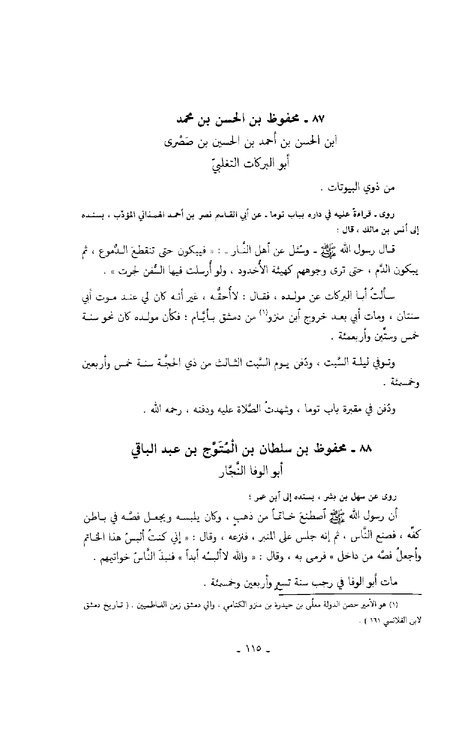 أبو الوفا النجار روى عن سهل بن بشر، بسنده إلى ابن عمر: أن رسول الله صَلَّى اللهُ عَلَيْهِ وَسَلَّمَ اصطنع خاتماً من ذهب، وكان يلبسه ويجعل فصه في باطن كفه، فصنع الناس، ثم جلس على المنبر، فنزعه، وقال: " إني كنت ألبس هذا الخاتم وأجعل فصه من داخل " فرمى به، وقال: " والله لا ألبسه أبداً " فنبذ الناس خواتيمهم.