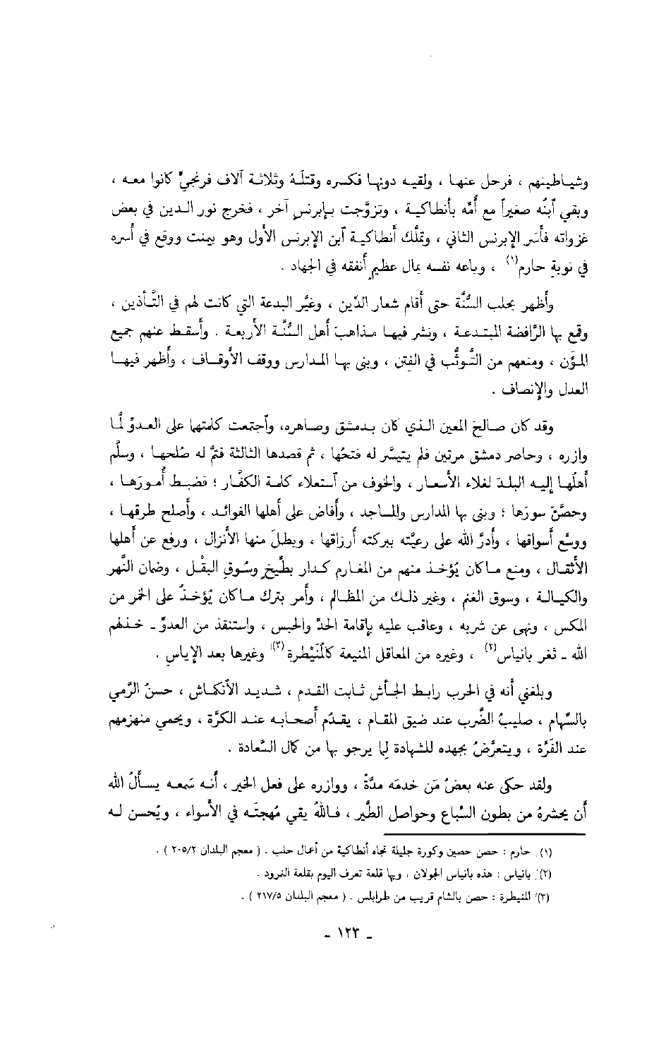 وقد كان صالح المعين الذي كان بدمشق وصاهره، واجتمعت كلمتهما على العدو لما وازره، وحاصر دمشق مرتين فلم يتيسر له فتحها، ثم قصدها الثالثة فتم له صلحها، وسلم أهلها إليه البلد لغلاء الأسعار، والخوف من استعلاء كلمة الكفار؛ فضبط أمورها، وحصن سورها؛ وبنى بها المدارس والمساجد، وأفاض على أهلها الفوائد، وأصلح طرقها، ووسع أسواقها، وأدر الله على رعيته ببركته أرزاقها، وبطل منها الأنزال، ورفع عن أهلها الأثقال، ومنع ما كان يؤخذ منهم من المغارم كدار بطيخ وسوق البقل، وضمان النهر والكيالة، ونهى عن شربه، وعاقب عليه بإقامة الحد والحبس، واستنقذ من العدو - خذلهم الله - ثغر بانياس، وغيره من المعاقل المنيعة كالمنيطرة وغيرها بعد الإياس.