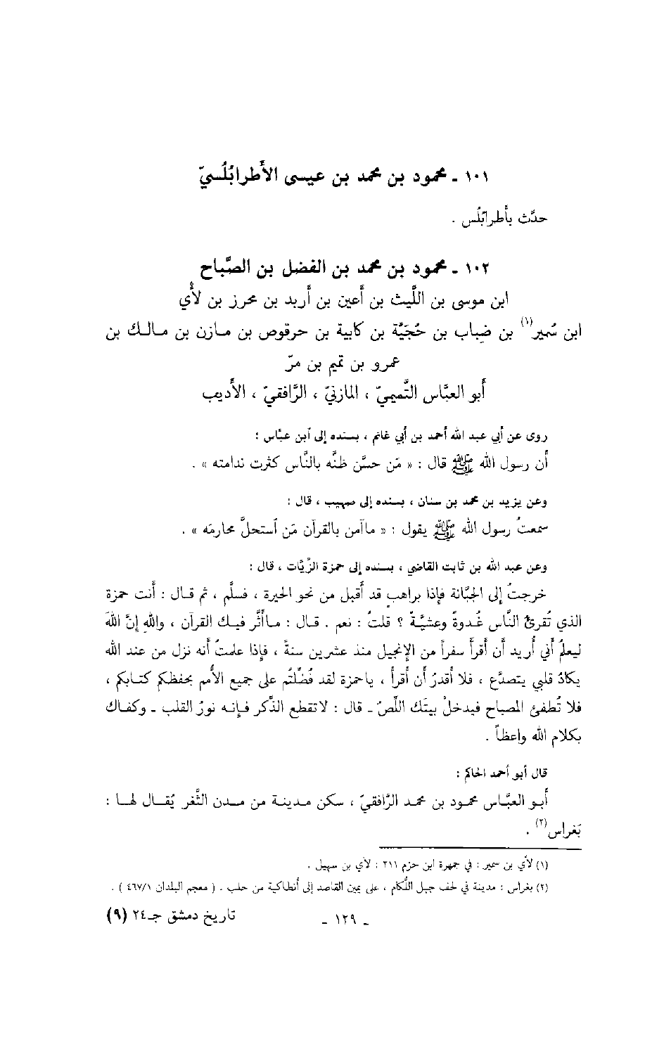 ابن الصباح بن موسى بن الليث بن أعين بن أربد بن محرز بن لأي ابن سمير بن ضباب بن حجية بن كابية بن حرقوص بن مازن بن مالك بن عمرو بن تميم بن مر أبو العباس التميمي، المازني، الرافقي، الأديب روى عن أبي عبد الله أحمد بن أبي غانم، بسنده إلى عباس: أن رسول الله صَلَّى اللهُ عَلَيْهِ وَسَلَّمَ قال: " من حسن ظنه بالناس كثرت ندامته ".