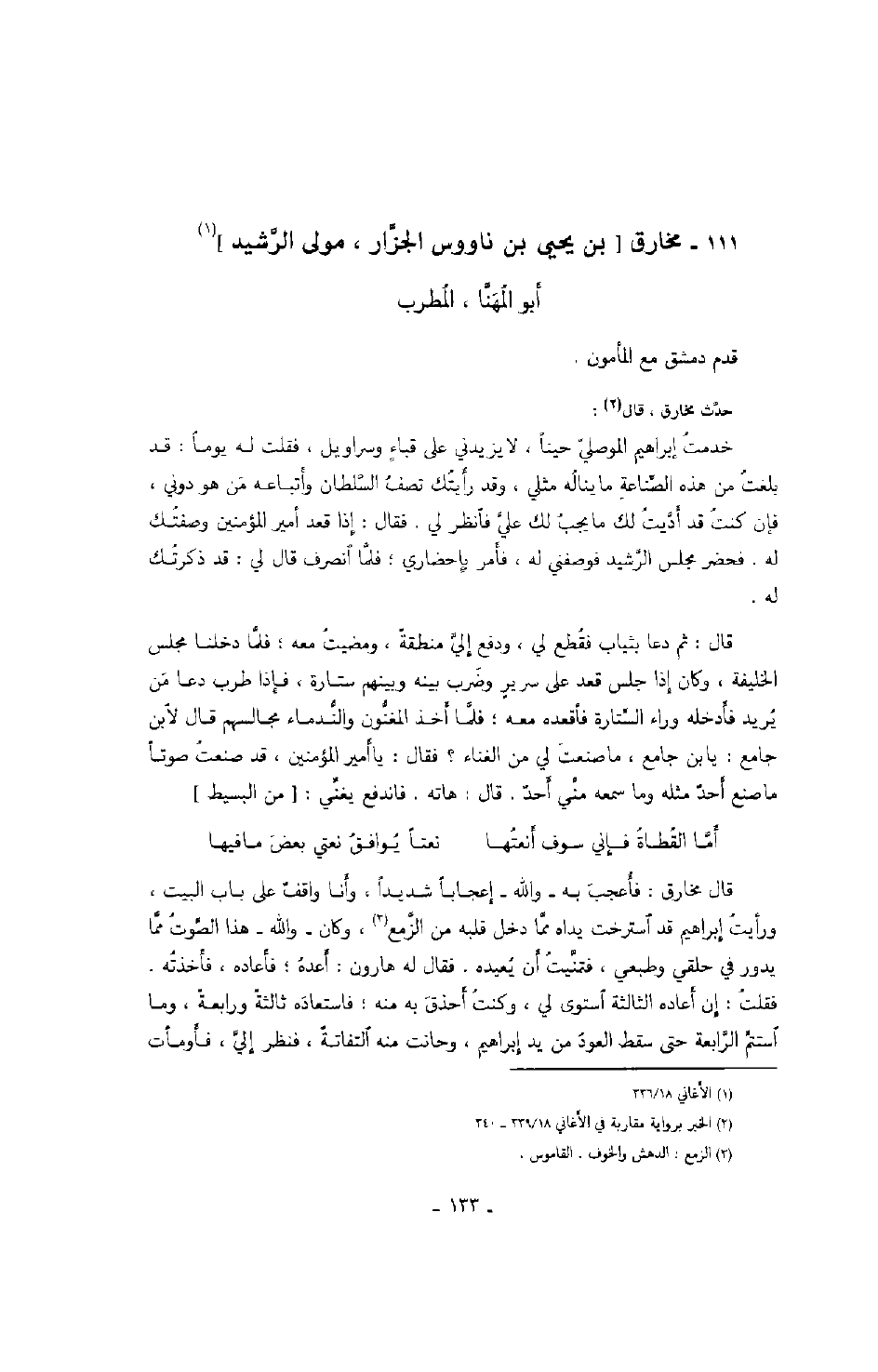 قال مخارق: فأعجب به - والله - إعجاباً شديداً، وأنا واقف على باب البيت، ورأيت إبراهيم قد استرخت يداه مما دخل قلبه من الزمع، وكان - والله - هذا الصوت مما يدور في حلقي وطبعي، فتمنيت أن يعيده. فقال له هارون: أعده؛ فأعاده، فأخذته. فقلت: إن أعاده الثالثة استوى لي، وكنت أحدق به منه؛ فاستعاده ثالثة ورابعة، وما استتم الرابعة حتى سقط العود من يد إبراهيم، وحانت منه التفاتة، فنظر إلي، فأومأت