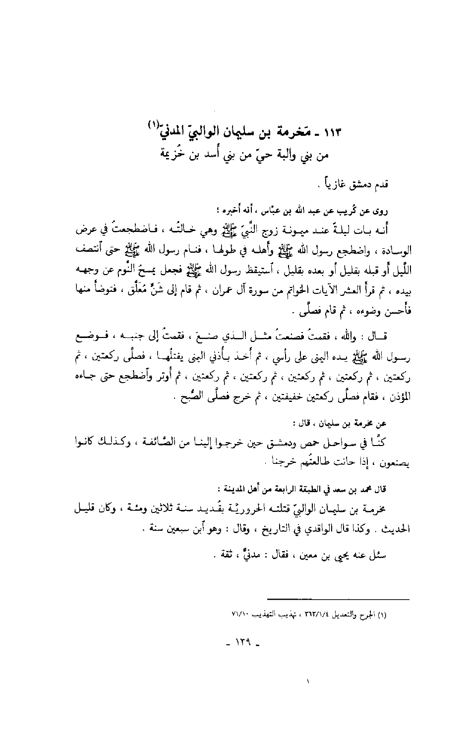 قال محمد ببن سعد في الطبقة الرابعة من أهل المدينة: مخرمة بن سليمان الوالبي قتلته الحرورية بقديد سنة ثلاثين ومئة، وكان قليل الحديث. وكذا قال الواقدي في التاريخ، وقال: وهو ابن سبعين سنة.
