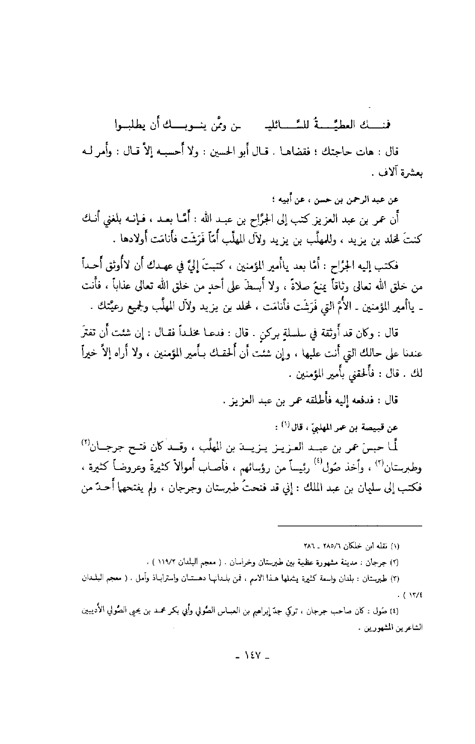عن قبيصة بن عمر المهلبي، قال: لما حبس عمر بن عبد العزيز يزيد بن المهلب، وقد كان فتح جرجان وطبرستان، وأخذ صول رئيساً من رؤسائهم، فأصاب أموالاً كثيرة وعروضاً كثيرة، فكتب إلى سليمان بن عبد الملك: إني قد فنحت طبرستان وجرجان، ولم يفتحهما أحد من