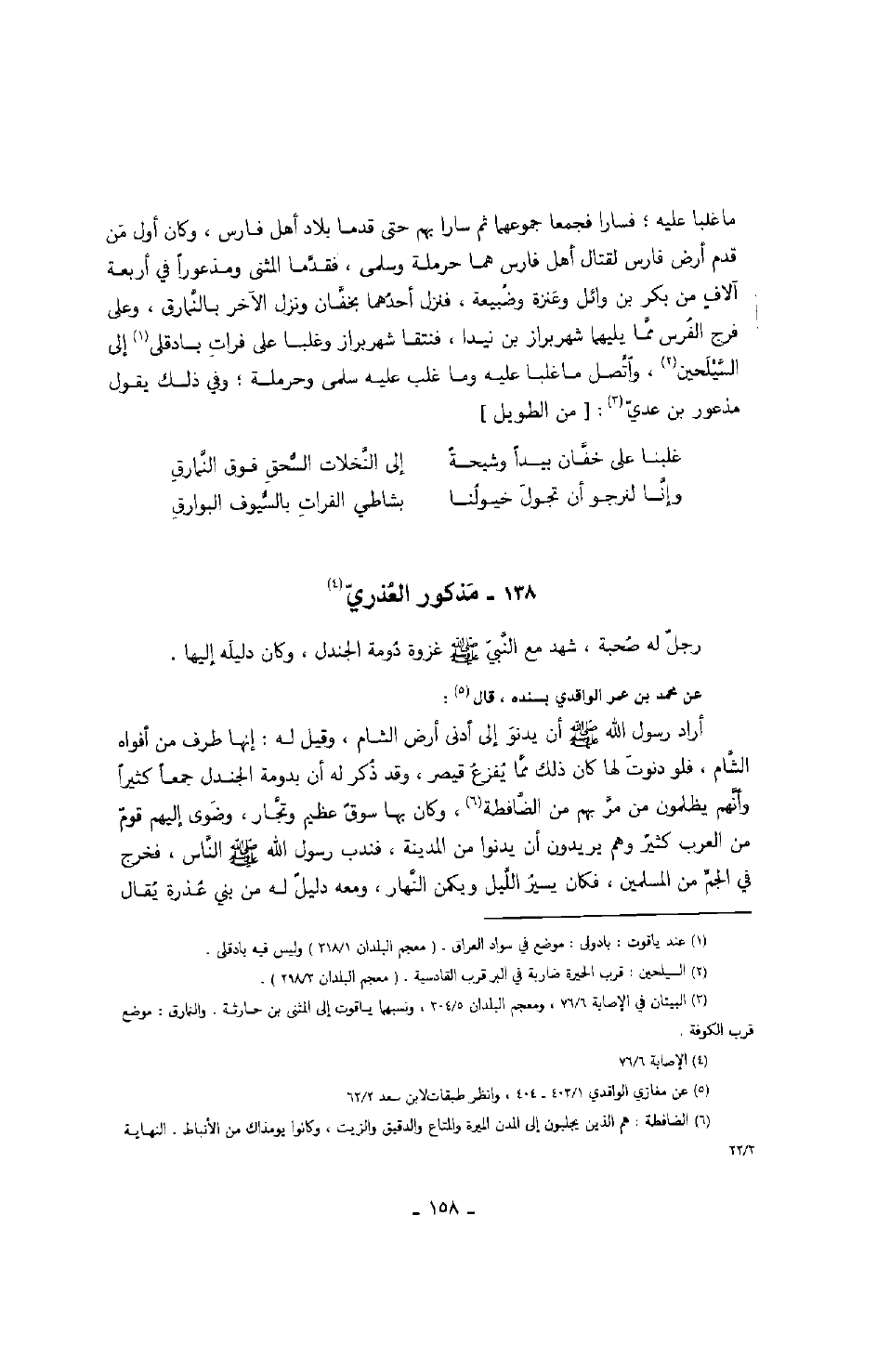 عن محمد بن عمر الوافدي بسنده، قال: أراد رسول الله صَلَّى اللهُ عَلَيْهِ وَسَلَّمَ أن يدنو إلى أرض الشام، وقيل له: إنها طرف من أفواه الشام، فلو دنوت لها كان ذلك مما يفزع قيصر، وقد ذكر له أن بدومة الجندل جمعاً كثيراً وأنهم يظلمون من مر بهم من الضافطة، وكان بها سوق عظيم وتجار، وضوى إليهم قوم من العرب كثير وهم يريدون أن يدنو من المدينة، فندب رسول الله صَلَّى اللهُ عَلَيْهِ وَسَلَّمَ الناس، فخرج من الجم من المسلمين، فكان يسير الليل ويكمن النهار، وعه دليل له من بني عذرة يقال