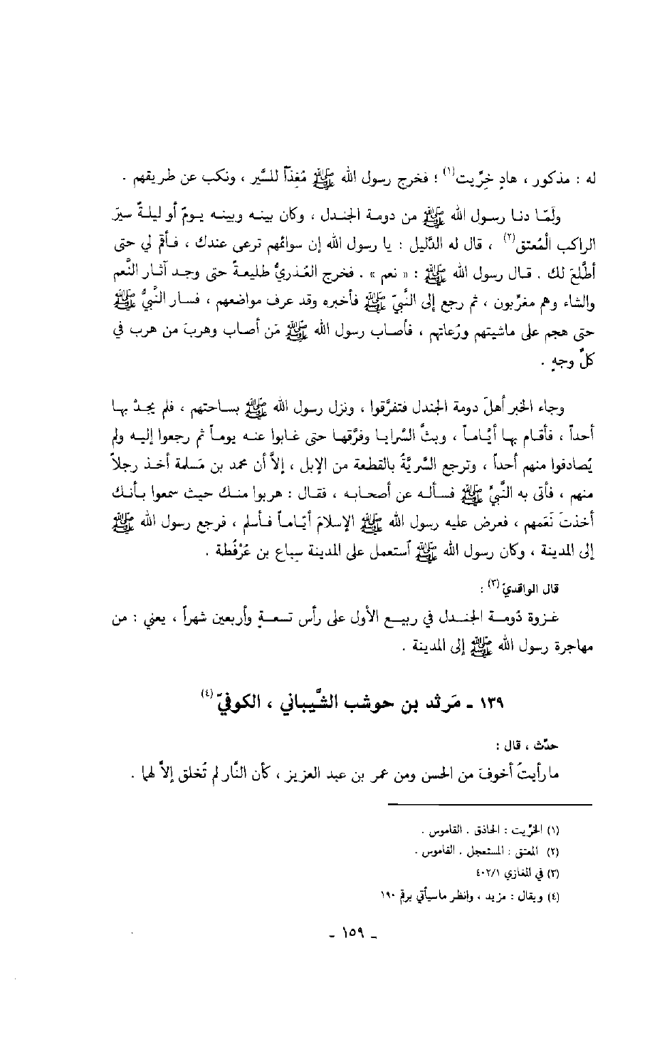 ولما دنا رسول الله صَلَّى اللهُ عَلَيْهِ وَسَلَّمَ من دومة الجندل، وكان بينه وبينه يوم أو ليلة سير الراكب المعتق، قال له الدليل: يا رسول الله إن سوائمهم ترعى عندك، فأقم لي حتى أطلع لك. قال رسول الله صَلَّى اللهُ عَلَيْهِ وَسَلَّمَ: " نعم ". فخرج العذري طليعة حتى وجد آثار النعم والشاء وهم مغربون، ثم رجع إلى النبي صَلَّى اللهُ عَلَيْهِ وَسَلَّمَ فأخبره وقد عرف مواضعهم، فسار النبي صَلَّى اللهُ عَلَيْهِ وَسَلَّمَ حتى هجم على ماشيتهم ورعاتهم، فأصاب رسول الله من أصاب وهرب من هرب في كل وجه.