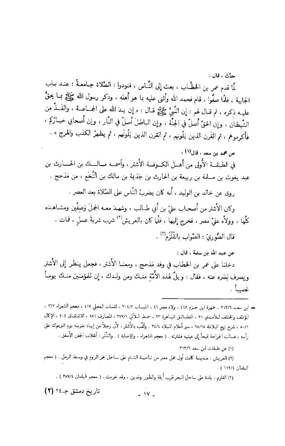 حدث، قال: لما قدم عمر بن الخطاب، بعث إلى الناس، فنودوا: الصلاة جامعة؛ عند باب الجابية، فلما صفوا، قام فحمد الله وأثنى عليه بما هو أهله، وذكر رسول الله صَلَّى اللهُ عَلَيْهِ وَسَلَّمَ بما يحق عليه ذكره، ثم قال لهم: إن النبي صَلَّى اللهُ عَلَيْهِ وَسَلَّمَ قال: " إن يد الله على الجماعة، والفذ من الشيطان، وإن الحق أصل في الجنة، وإن الباطل أصل في النار، وإن أصحابي خياركم، فأكرموهم، ثم القرن الذي يلونهم، ثم القرن الذي يلونهم، ثم يظهر الكذب والهرج ".