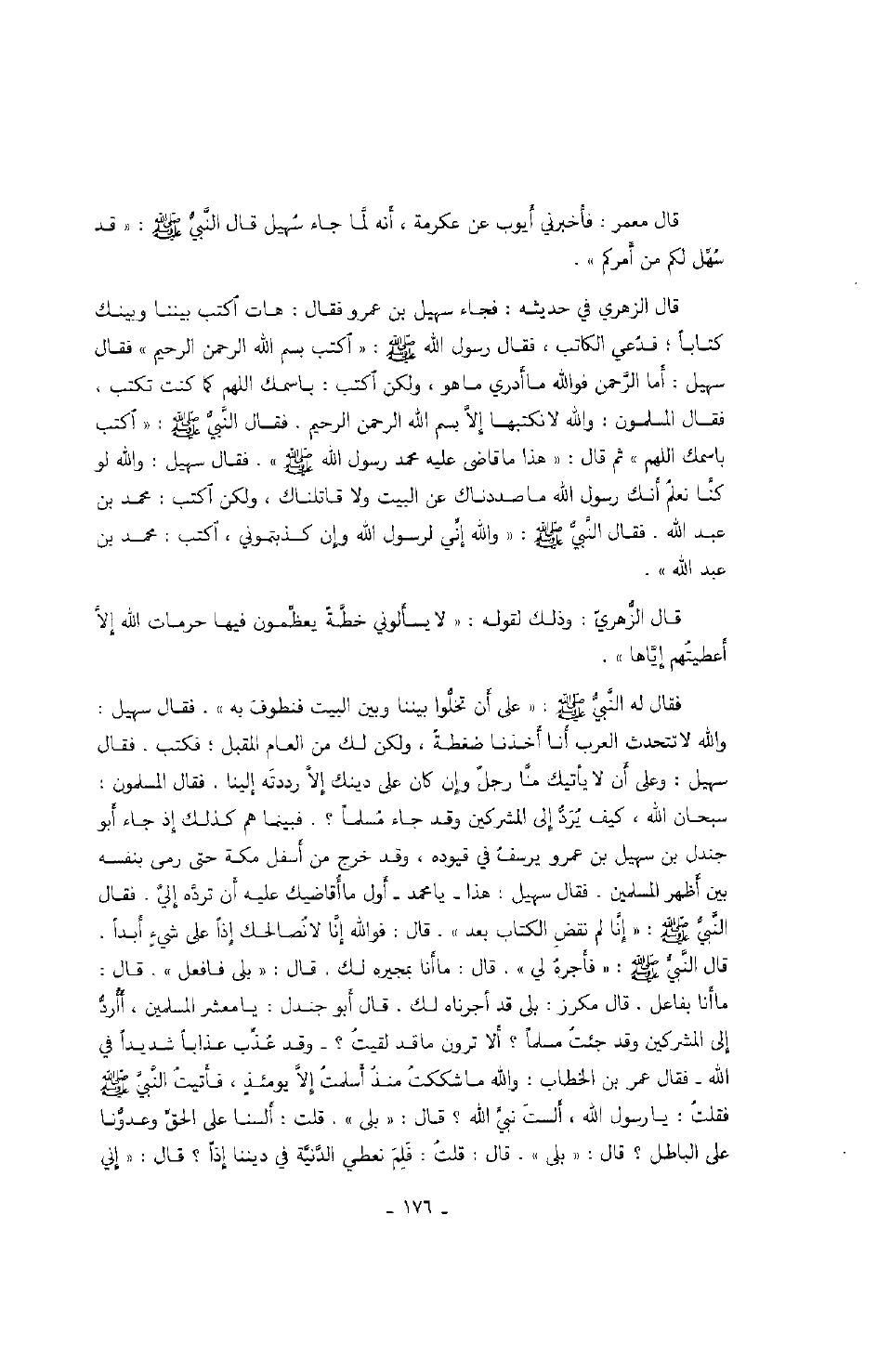 قال الزهري في حديثه: فجاء سهيل بن عمرو فقال: هات اكتب بيننا وبينك كتاباً؛ فدعي الكاتب، فقال رسول الله صَلَّى اللهُ عَلَيْهِ وَسَلَّمَ: " اكتب بسم الله الرحمن الرحيم " فقال سهيل: أما الرحمن فوالله ما أدري ما هو، ولكن اكتب: باسمك اللهم كما كنت تكتب، فقال المسلمون: والله لا نكتبها إلا بسم الله الرحمن الرحيم. فقال النبي صَلَّى اللهُ عَلَيْهِ وَسَلَّمَ: " اكتب باسمك اللهم " ثم قال: " هذا ما قاضى عليه محمد رسول الله ". فقال سهيل: والله لو كنا نعلم أنك رسول الله ما صددناك عن البيت ولا قاتلناك، ولكن اكتب: محمد بن عبد الله. فقال النبي صَلَّى اللهُ عَلَيْهِ وَسَلَّمَ: " والله إني لرسول الله وإن كذبتموني، اكتب: محمد بن عبد الله ".