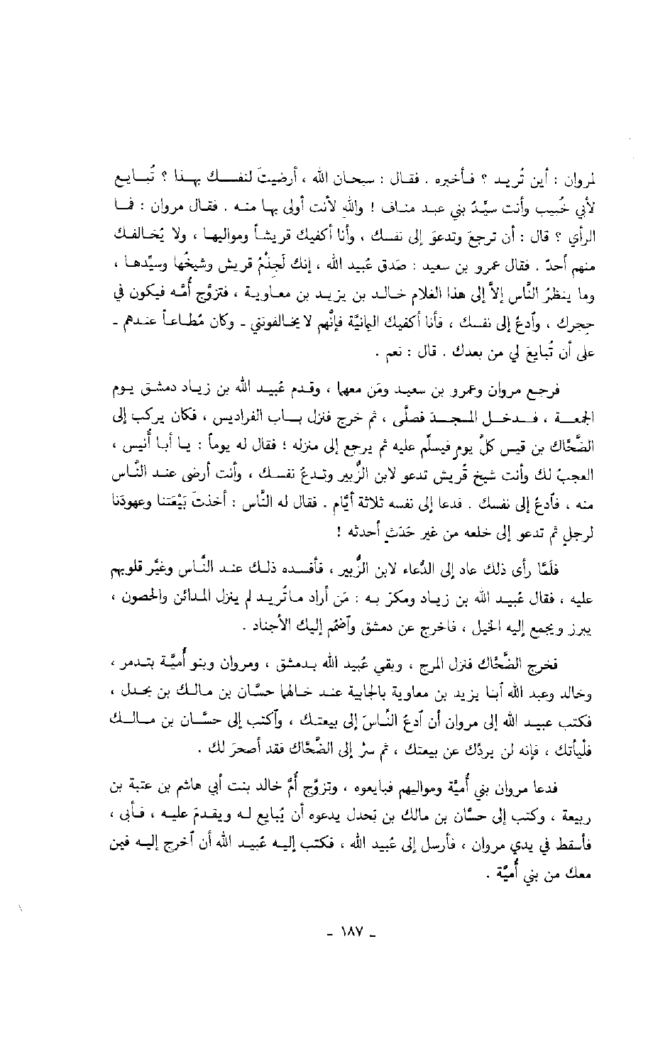 لمروان: أين تريد؟ فأخبره. فقال: سبحان الله، أرضيت لنفسك بهذا؟ تبايع لأني خبيب وأنت سيد بني عبد مناف! والله لأنت أولى بها منه. فقال مروان: فما الرأي؟ قال: أن ترجع وتدعو إلى نفسك، وأنا أكفيك قريشاً ومواليها، ولا يخالفك منهم أحد. فقال عمرو بن سعيد: صدق عبيد الله، إنك لجذم قريش وشيخها وسيدها، وما ينظر الناس إلا إلى هذا الغلام خالد بن يزيد بن معاويد، فتزوج أمه فيكون في حجرك، وادع إلى نفسك، فأنا أكفيك اليمانية فإنهم لا يخالفونني - وكان مطاعاً عندهم - على أن تبايع لي من بعدك. قال: نعم.