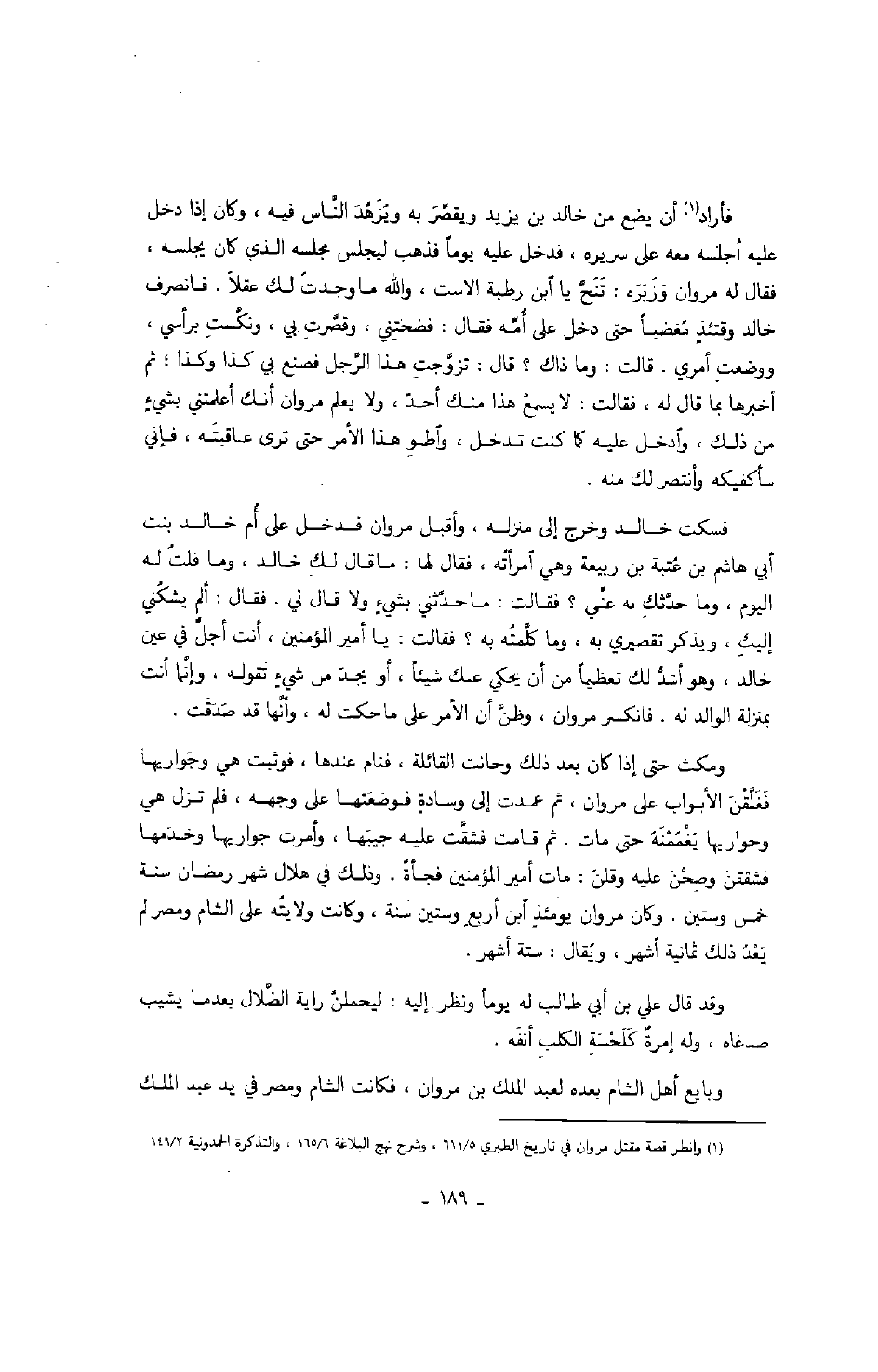 فأراد أن يضع من خالد بن يزيد ويقصر به ويزهد الناس فيه، وكان إذا دخل عليه أجلسه معه إلى سريره، فدخل عليه يوماً فذهب ليجلس مجلسه الذي كان يجلسه، فقال له مروان وزبره: تنح يا ابن رطبة الاست، والله ما وجدت لك عقلاً. فانصرف خالد وقتئذ مغضباً حتى دخل على أمه فقال: فضحتني، وقصرت بي، ونكست برأسي، ووضعت أمري. قالت: وما ذاك؟ قال: تزوجت هذا الرجل فصنع بي كذا وكذا؛ ثم أخبرها بما قال له، فقالت: لا يسمع هذا منك أحد، ولا يعلم مروان أنك أعلمتني بشيء من ذلك، وادخل عليه كما كنت تدخل، واطو هذا الأمر حتى ترى عاقبته، فإني سأكفيكه وأنتصر لك منه.