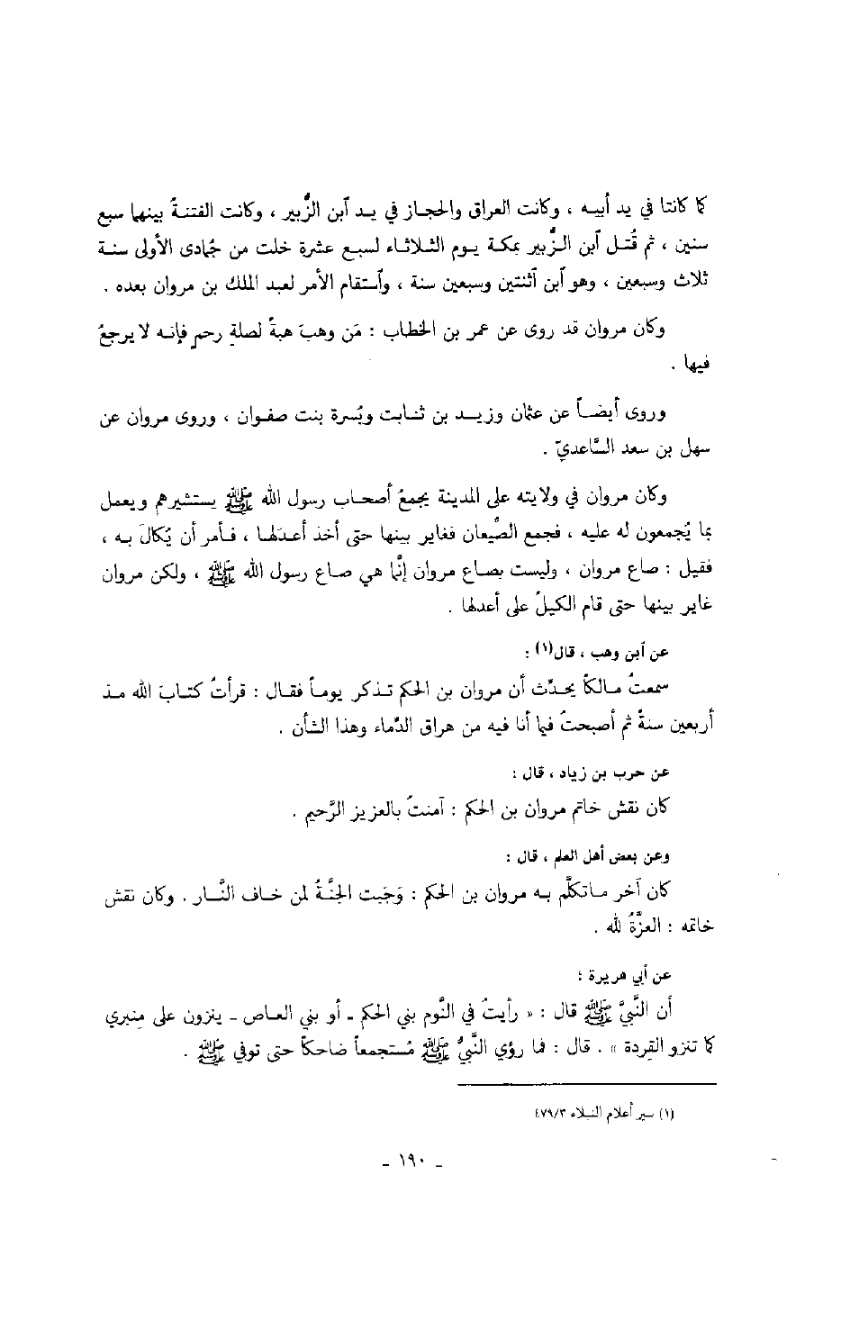 عن ابن وهب، قال: سمعت مالكاً يحدث أن مروان بن الحكم تذكر يوماً فقال: قرأت كتاب الله مذ أربعين سنة ثم أصبحت فيما أنا فيه من هراق الدماء وهذا الشأن.