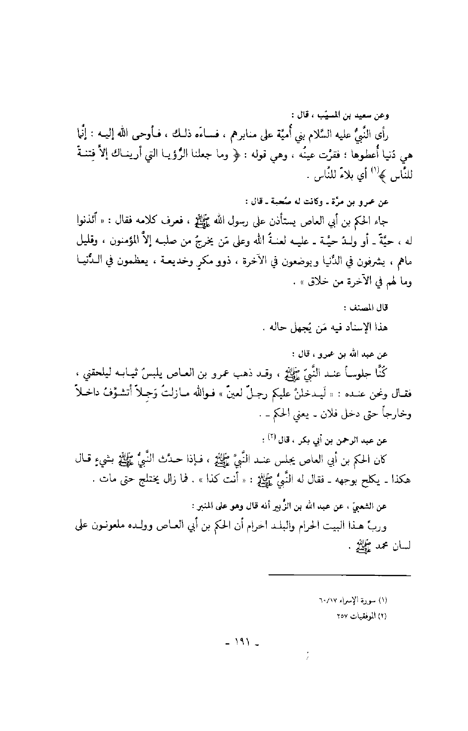 عن عبد الله بن عمرو، قال: كنا جلوساً عند النبي صَلَّى اللهُ عَلَيْهِ وَسَلَّمَ، وقد ذهب عمرو بن العاص يلبس ثيابه ليلحقني، فقال ونحن عنده: " ليدخلن عليكم رجل لعين " فوالله ما زلت وجلاً أتشوف داخلاً وخارجاً حتى دخل فلان - يعني الحكم -.
