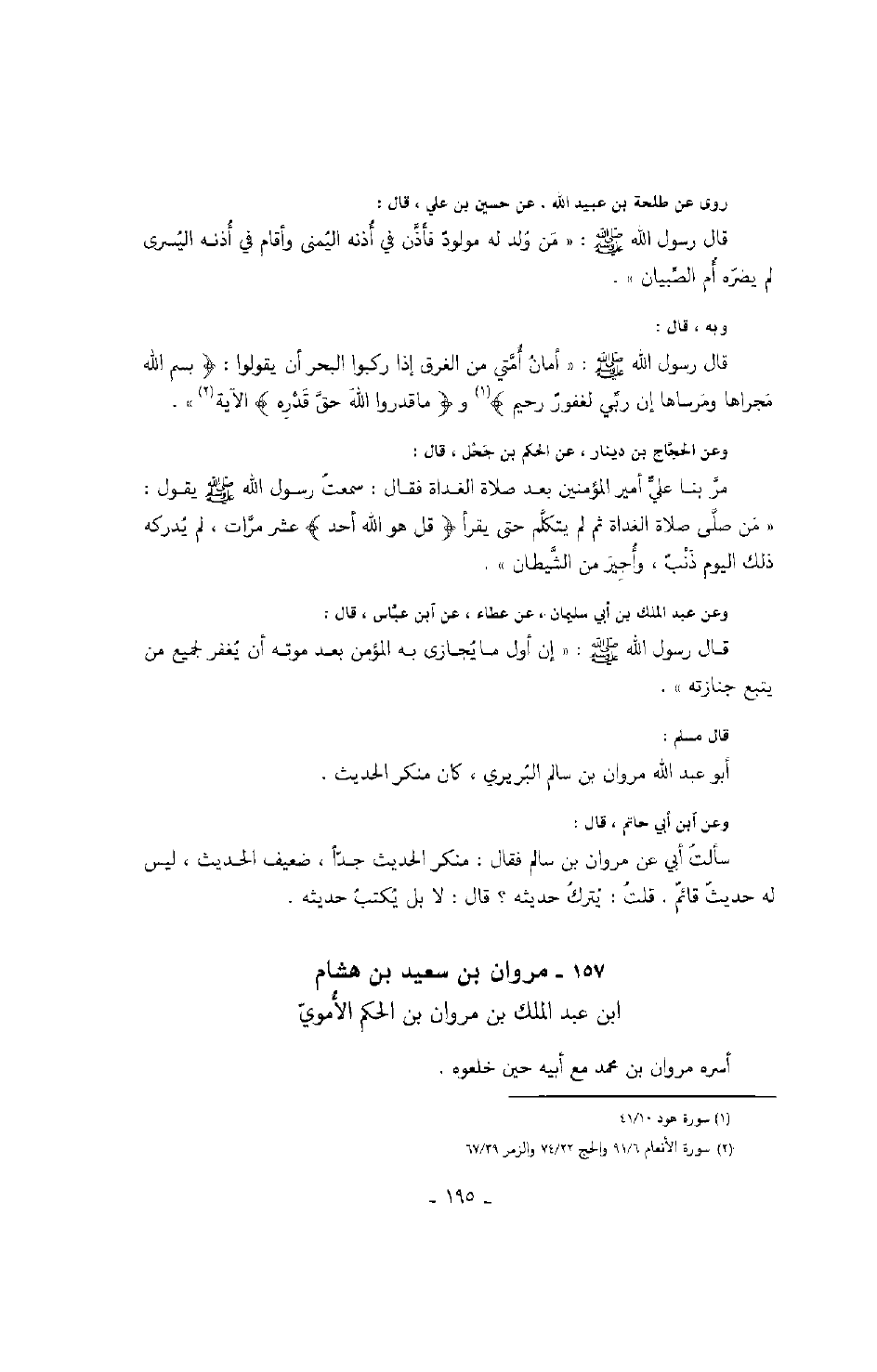 روى عن طلحة بن عبيد الله، عن حسين بن علي، قال: قال رسول الله صَلَّى اللهُ عَلَيْهِ وَسَلَّمَ: " من ولد له مولود فأذن في أذنه اليمنى وأقام في أذنه اليسرى لم يضره أم الصبيان ".