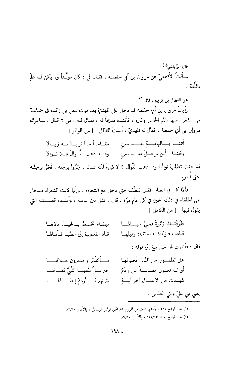 عن الفضل بن بزيغ، قال: رأيت مروان بن أبي حفصة قد دخل على المهدي بعد موت معن بن زائدة في جماعة من الشعراء منهم سلم الخاسر وغيره، فأنشده مديحاً له، فقال له: من؟ قال: شاعرك مروان بن أبي حفصة. فقال المهدي: ألست القائل: " من الوافر "